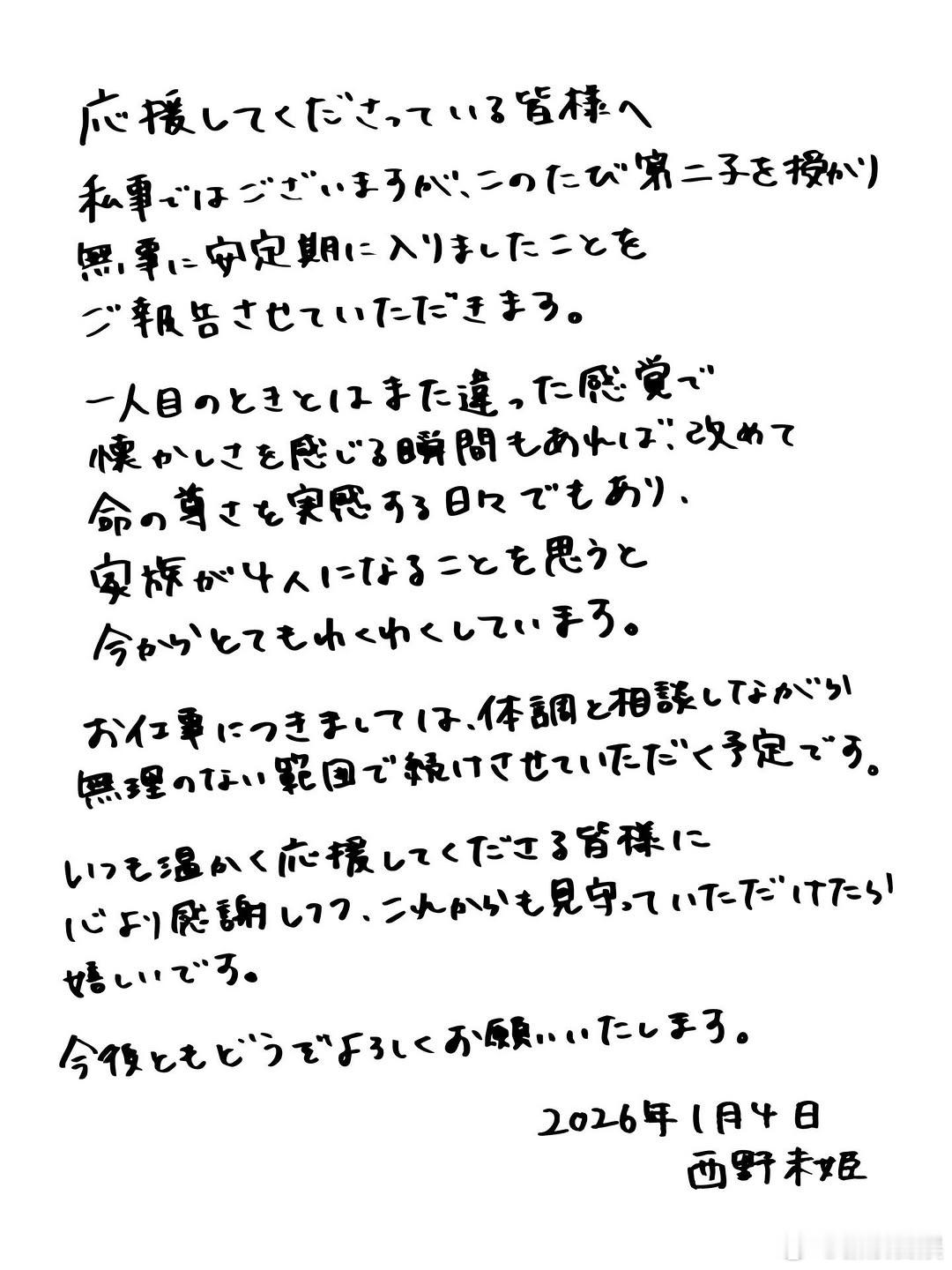 西野未姬 (26)于4日通过个人SNS宣布怀孕,这是她和搞笑艺人山本圭壱 (57)的第二个孩子。