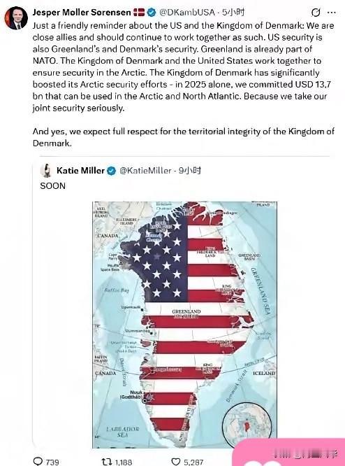 丹麦驻美大使是真的吓坏了! 目前美国网络一片沸腾,部分美国网友发帖,要求趁着抓捕老马夫妇的余威,要求立刻拿下格陵兰岛的控制权。尤其是美国的MAGA团体,将格陵兰岛的地图,画上了美国的国旗。丹麦驻美大使立刻发帖表示丹麦不希望盟友内部之间出现问题。 这可不是美国第一次打格陵兰岛的主意,这份野心藏了足足一百多年。1867年美国买阿拉斯加时就想顺手拿下它,1946年杜鲁门直接出价1亿美元想买,现在特朗普更是放话“不排除军事胁迫”,架势一次比一次凶。 格陵兰岛能让美国如此执着,家底实在太厚。216万平方公里的土地上,埋着150万吨稀土——这可是新能源汽车、导弹的命根子,还有175亿桶石油和4.15万亿立方米天然气,全球都盯着这块宝地。 地理位置更是绝无仅有,它处在华盛顿到莫斯科的最短路线上,北极航道开通后,这里就是连接欧美亚的黄金水道。过去十年北极通航船只多了37%,谁控制这里,就攥住了全球航运的关键节点。 美国早就在这里扎了根,格陵兰西北部的皮图菲克太空基地,距北极才1500多公里,雷达能监视俄罗斯大半领土,2023年还部署了可带核弹的F-35A战斗机,军事价值无可替代。 MAGA团体这次跳得最高,背后是典型的民粹逻辑。他们靠着社交媒体煽动情绪,把格陵兰岛当成“美国优先”的战利品,却忘了这是丹麦的领土,格陵兰自治政府早明说“永远是非卖品”。 丹麦也不是软柿子,近期特意修改国徽,放大象征格陵兰的北极熊图案,就是高调宣示主权。欧盟更是直接把对格陵兰的拨款翻倍到5.3亿欧元,摆明了要和美国掰手腕。 历史早有教训,1968年美军轰炸机在格陵兰坠毁,四枚氢弹泄漏,至今还有一枚没找到,当地放射性污染几十年没消散。这种“保护”,丹麦和格陵兰人可受不起。 盟友之间哪能这么明火执仗抢地盘?美国一边喊着“亲密伙伴”,一边动起吞并心思,只会让欧洲盟友寒心。国际秩序讲究主权平等,真要硬来,只会引发更多连锁反应。 各位读者你们怎么看?欢迎在评论区讨论。