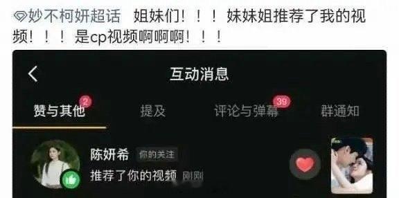 陈妍希推荐与周柯宇的cp视频陈妍希这是带头嗑cp啦~陈妍希居然在社交平台推荐了与周柯宇的cp视频,看来陈妍希对周柯宇还挺有好感的,不知道咱们的男主周柯宇会不会回应陈妍希啊,妙不柯妍能顺利二搭嘛~陈妍希安利妙不柯妍cp视频