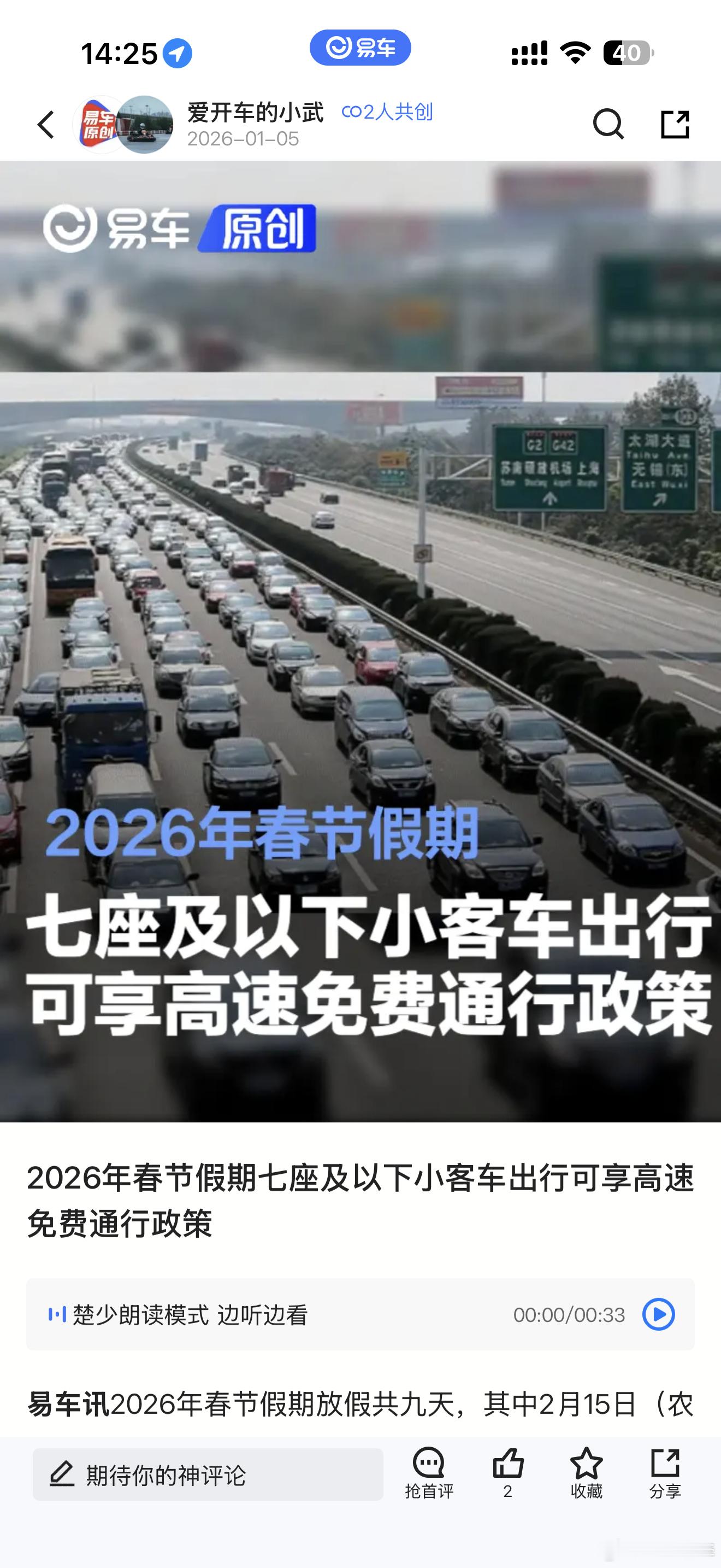 今年的高速免费通行从2月15号零点就开始了也就意味着可以14号出发,15号零点下高速相当于可以腊月28出发 29到家让很多人可以享受到实实在在的国家优惠政策 珠海