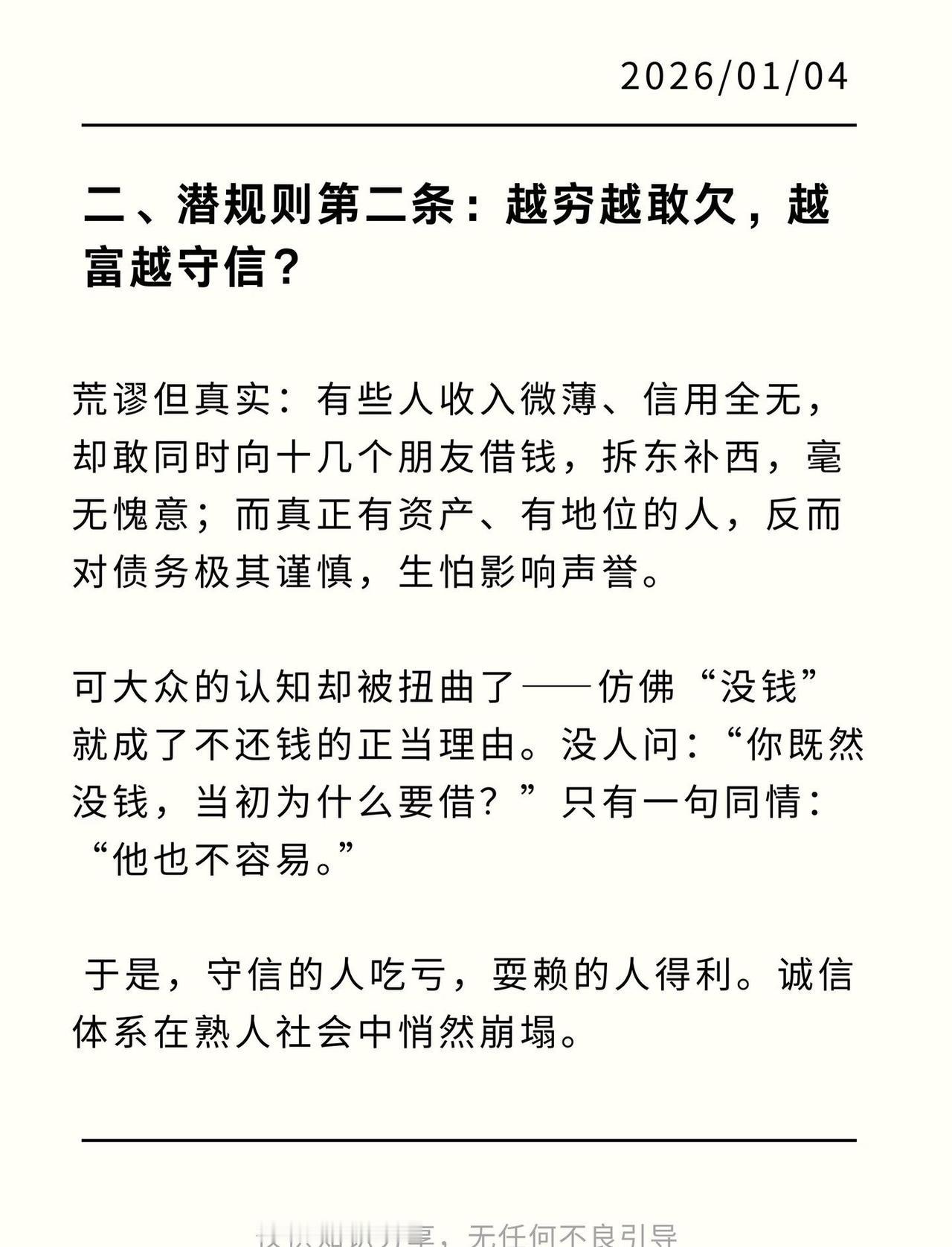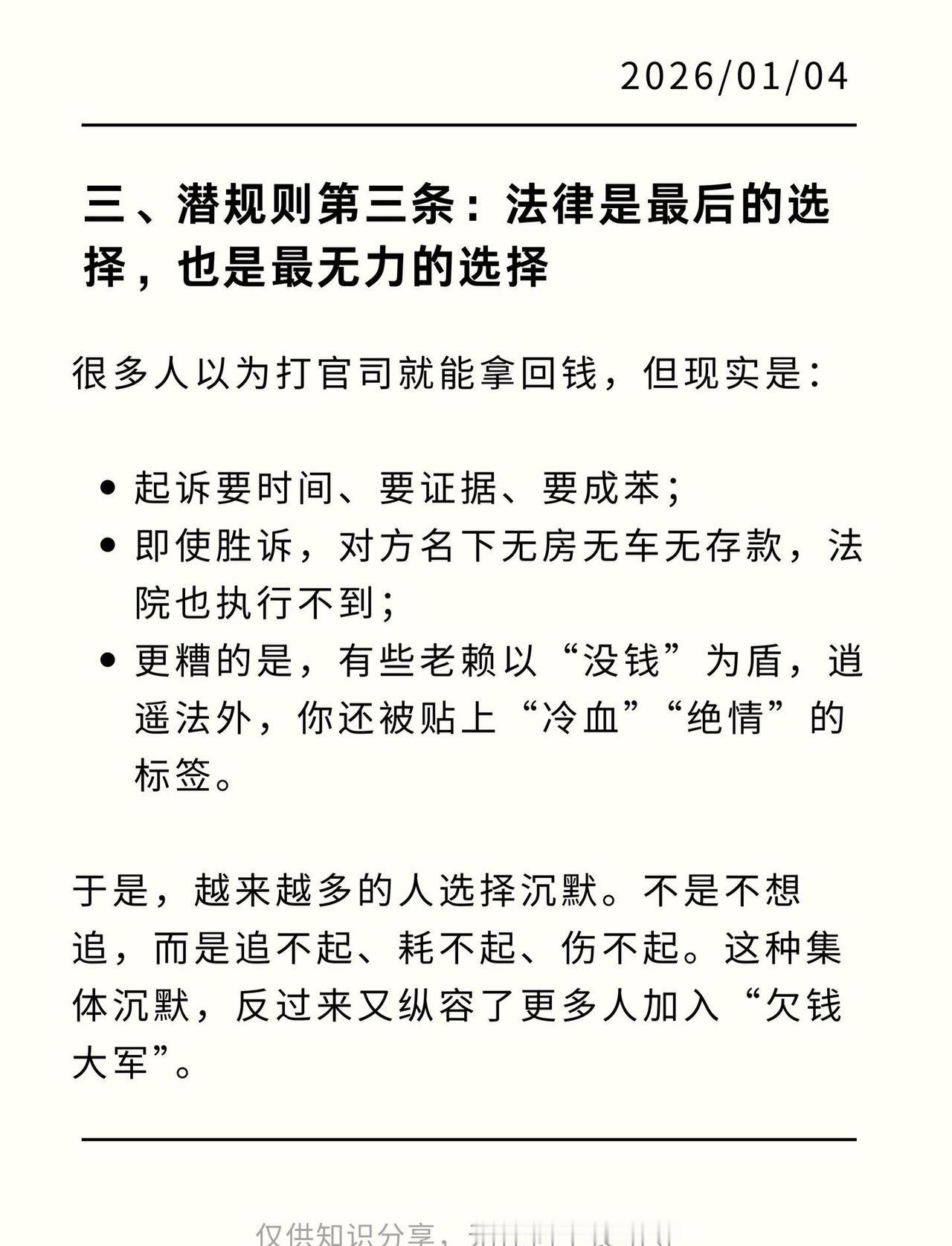 这已经是欠钱不还公认的潜规则了! 曾几何时,“欠债还钱”是镌刻在诚信基石上的公理。 如今,这块基石似乎正在被一套心照不宣的“潜规则”悄然侵蚀。这套规则,没有明文规定,却在某些角落被奉为圭臬。 它不是写在纸上的法律,而是某些“老赖”心照不宣的行为准则。 欠钱不还 老赖克星 网上立案 老赖无处可逃 借钱与还钱 潜规则