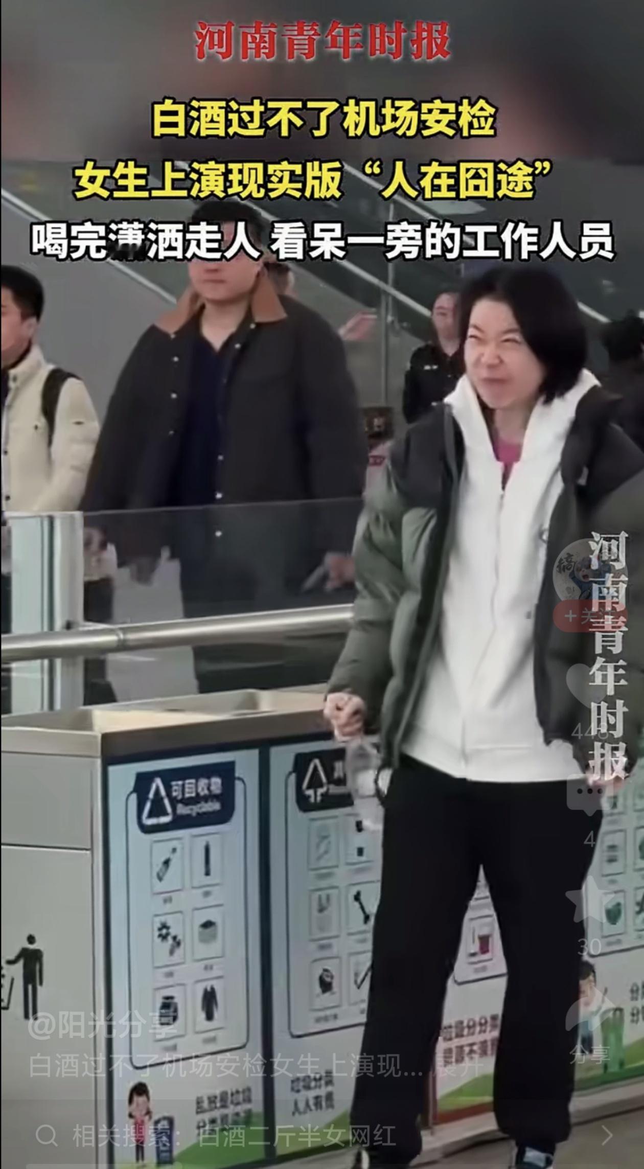 女子机场安检前干光一瓶白酒,上演现实版人在囧途。 这位女子因为携带的白酒过不了安检,干脆当场拧开瓶子仰头猛灌,一气喝完后潇洒离场,把旁边的工作人员都看呆了😂 这操作属实硬核,不过也得提醒大家:机场安检对酒类携带是有明确规定的,散装白酒、过量瓶装白酒都无法随身带上飞机,提前了解规则才不会手忙脚乱呀~