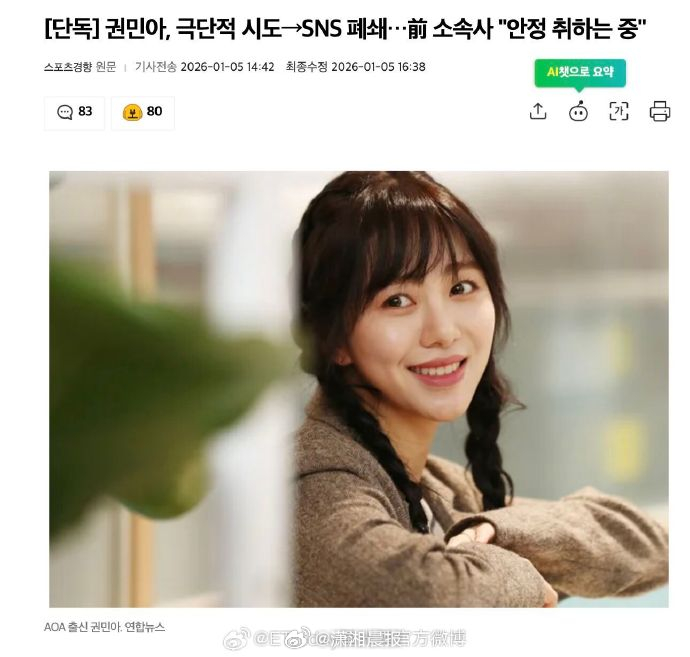 #权珉娥近况#【#公司回应权珉娥自杀未遂#:她现在在家里休养中,不用担心没关系】 据ETtoday星光雲报道,权珉娥1日突然在IG发出轻生文,2个小时获救后,她突然在IG上连续发布5条文章,诉说着自己的悲惨童年,过去遭到性侵、队内霸凌等事件,向大众求救并痛喊“为什么想要我死”。事件发生5日过去,权珉娥的ins账号突然遭关闭,令歌迷非常担心;对此,她的公司稍早紧急对外发声,“权珉娥现在在家里安定地休养中,不用担心没关系。”