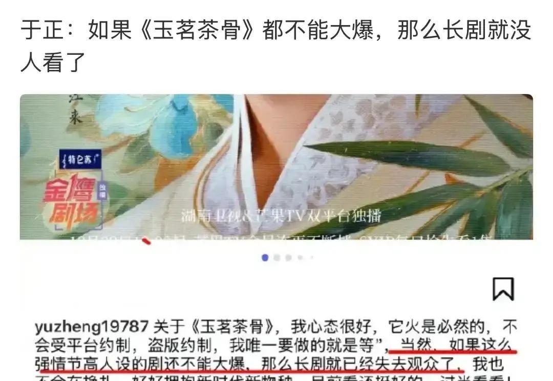 于正新剧《玉茗茶骨》播完连热搜尾巴都没摸到,他倒先跳出来怪演员不卖力、平台不给档期。 我追了十集,剧情像隔夜茶,寡淡还带点涩,服化道复制粘贴他七年前的宫墙绿,女主哭戏靠眼药水,男主台词像AI朗读。 观众不是瞎子,豆瓣 1都嫌多,他倒好,把锅甩得比剧情反转还快。 当年《延禧》爆是他本事,如今扑街也得认,毕竟遥控器在我手里,烂剧一秒换台,谁有空陪他玩过家家。 创作者敢写敢拍就得敢背成绩,甩锅只能把路人缘一起甩飞,下次开机前先把剧本炖出味,再谈天时地利。