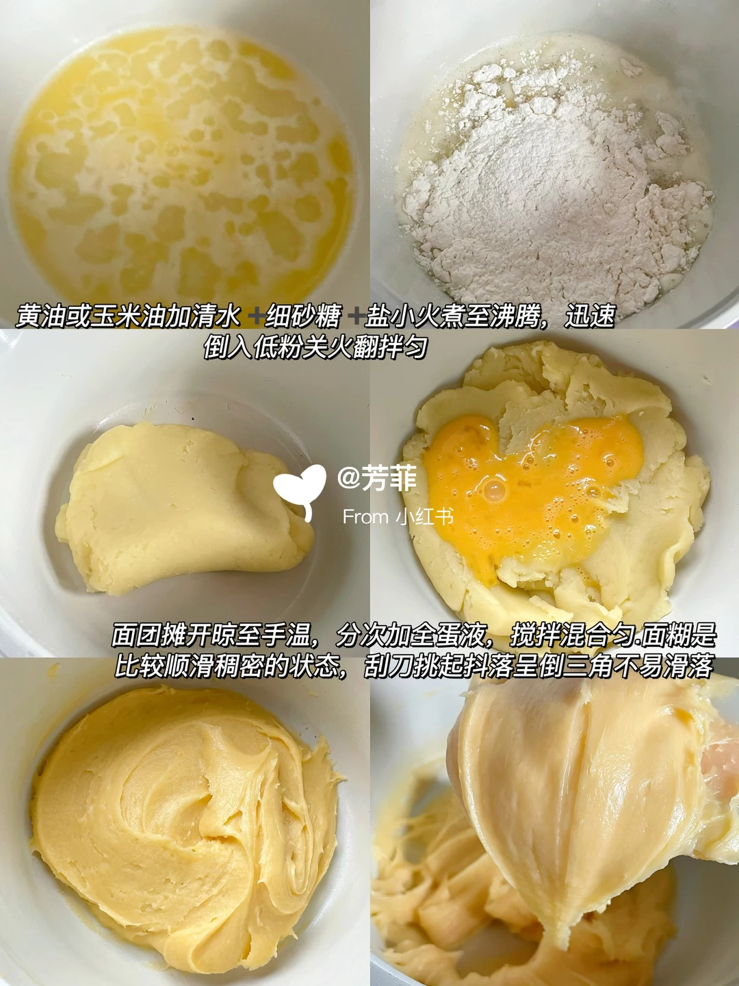 黄油或玉米油25g | 清水75g | 细砂糖10g | 盐1g | 低筋面粉70g | 鸡蛋1~1.5个
