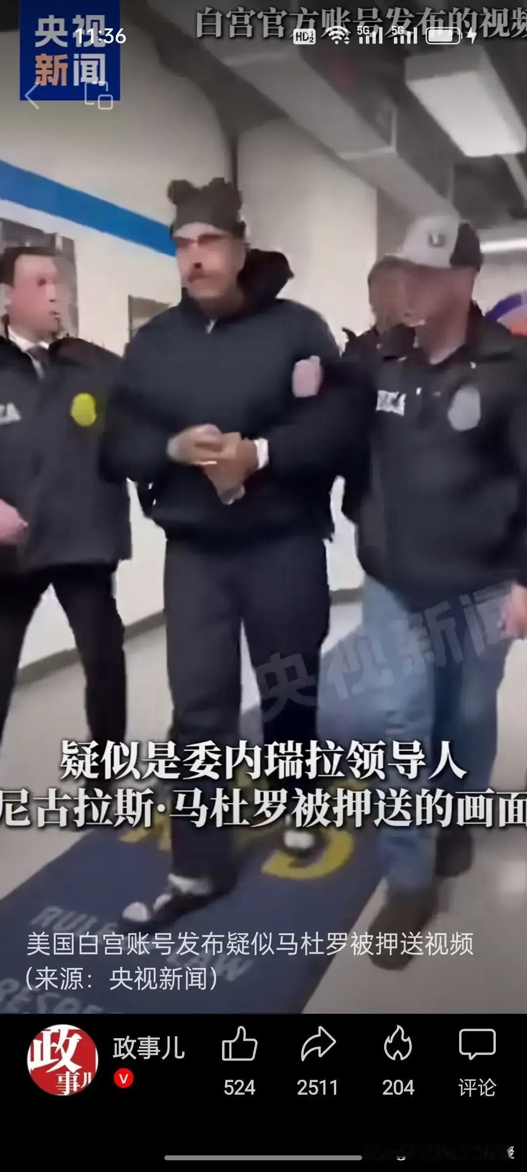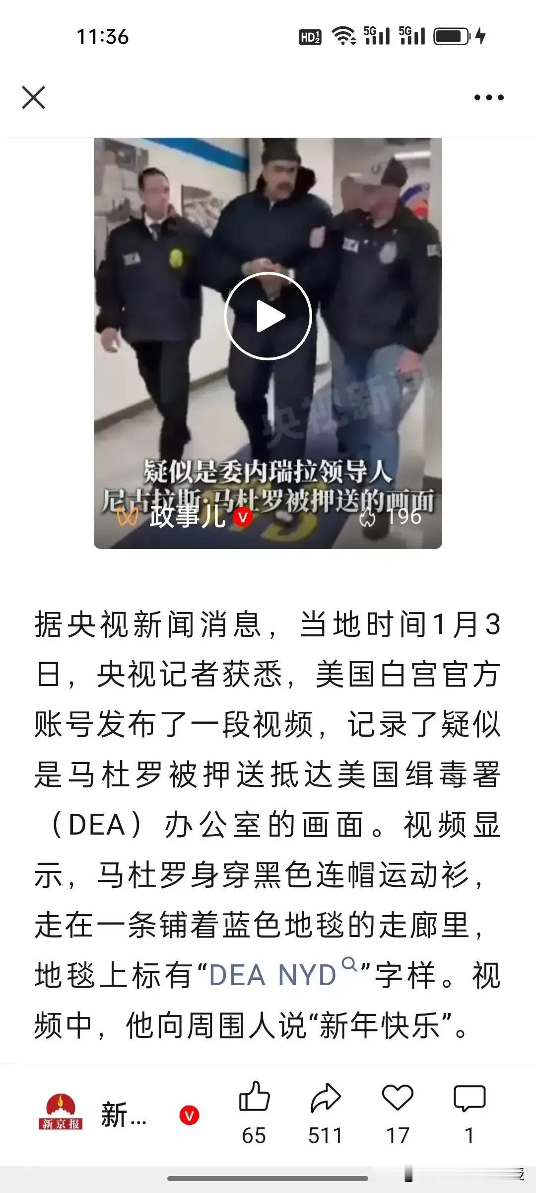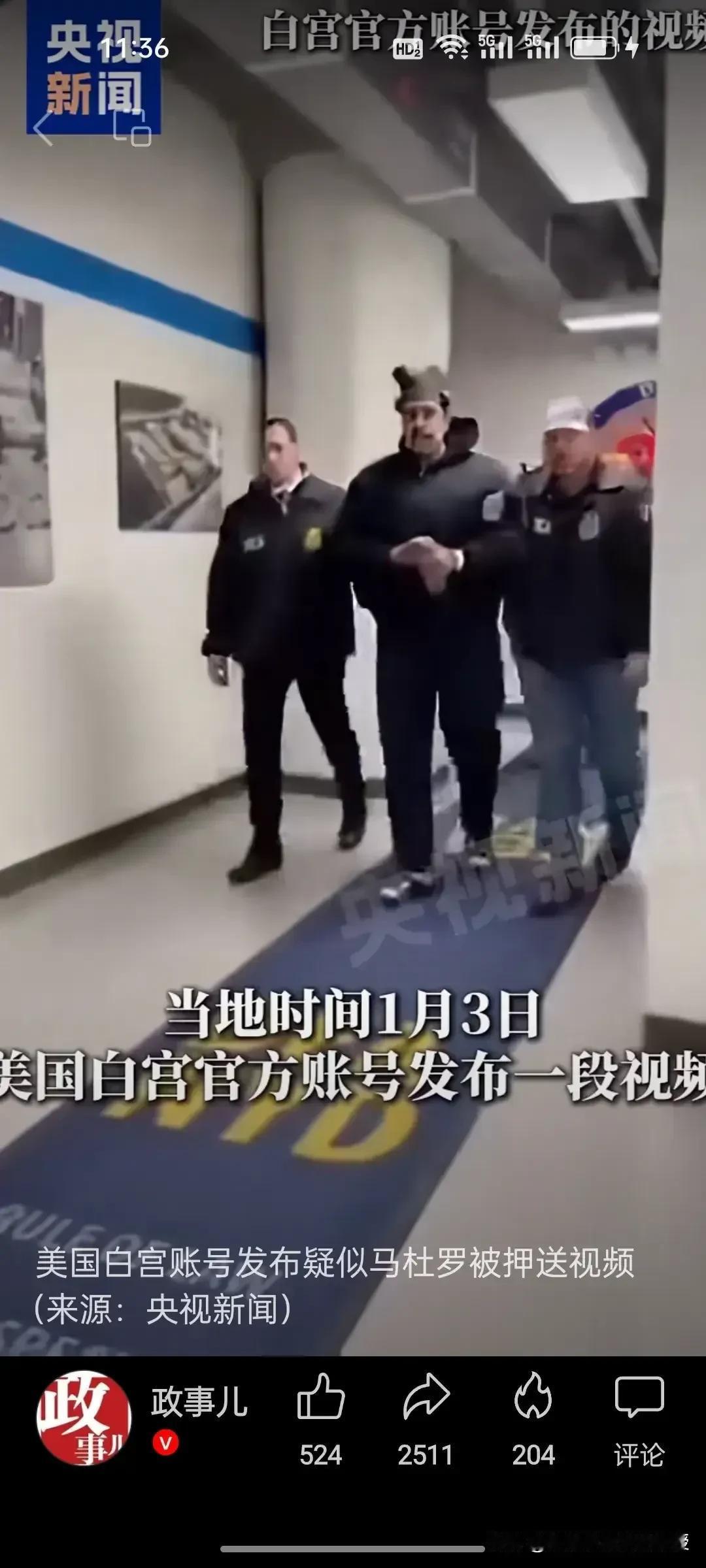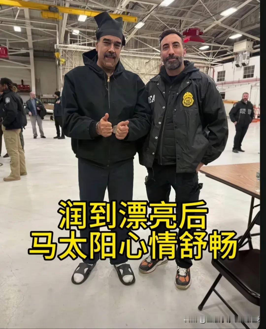 全网都在传下图,这说明目前马杜罗是安全的,他抵达美国缉毒署时换了一身黑的衣服,一边走还向周围的人说“新年快乐”,图一中,他和工作人员合影,还双手竖起大拇指,微笑着,看起来心态平和,也许他一直在想始终会等来这一天,只是没想到这么快到了,也是如释重负了。