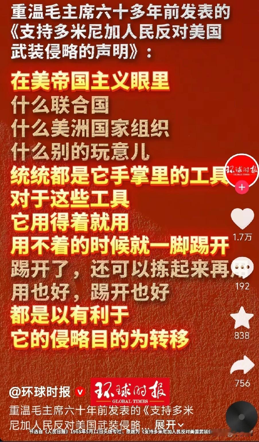 重温毛主席六十多年前发表的《支持多米尼加人民反对美国武装侵略的声明》,伟人有独特的见解,里面的话放到今天看,依旧一针见血! 在美帝国主义眼里,联合国、美洲国家组织这类机构,不过是它手掌里的工具:用得着就拿来用,用不着就一脚踢开,踢开了还能再拣起来,一切都以满足它的侵略目的为转移。 六十年过去,这样的本质丝毫未变,这就是最真实的写照!