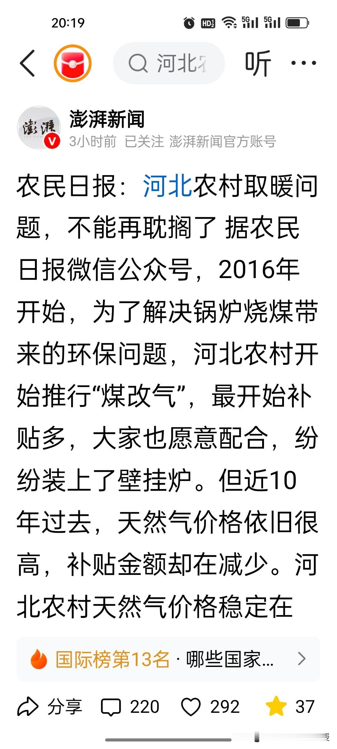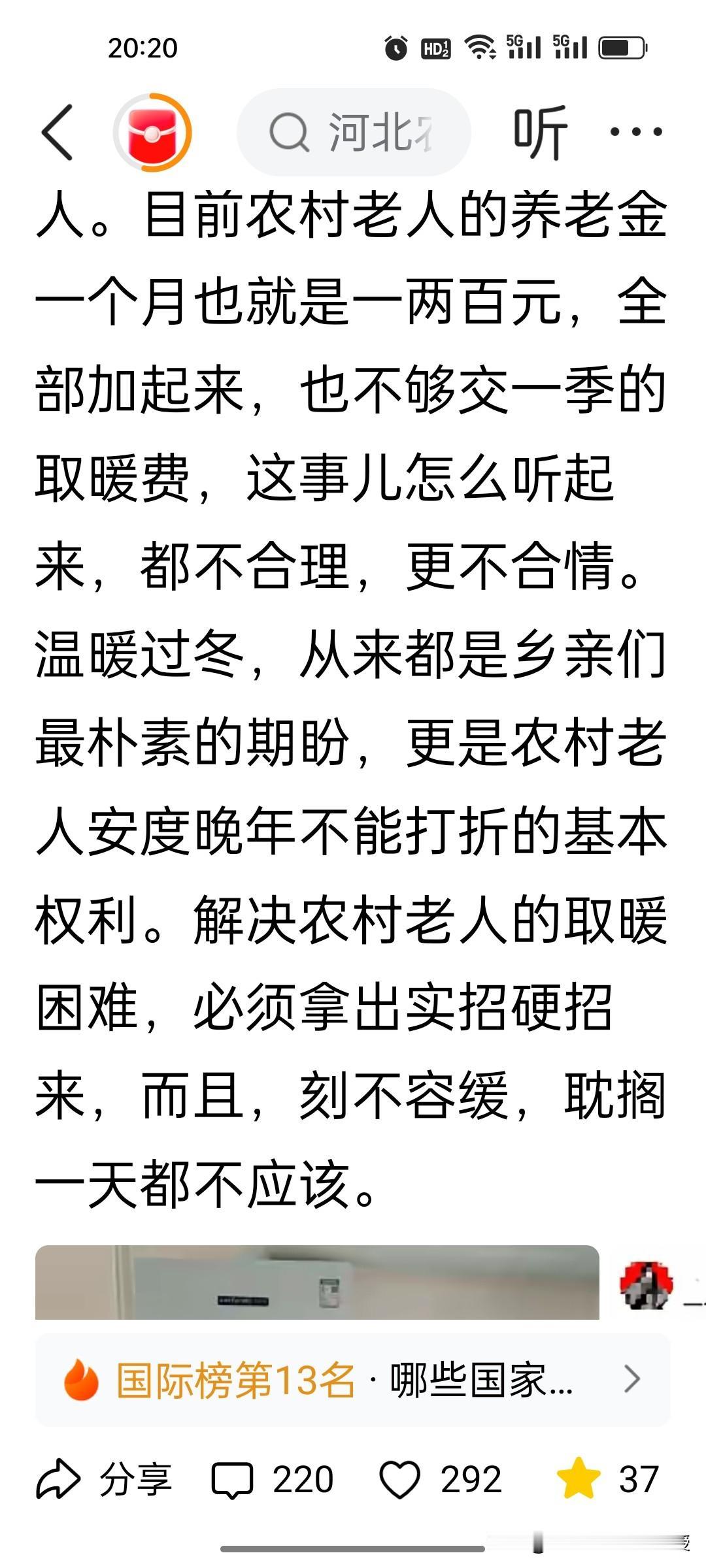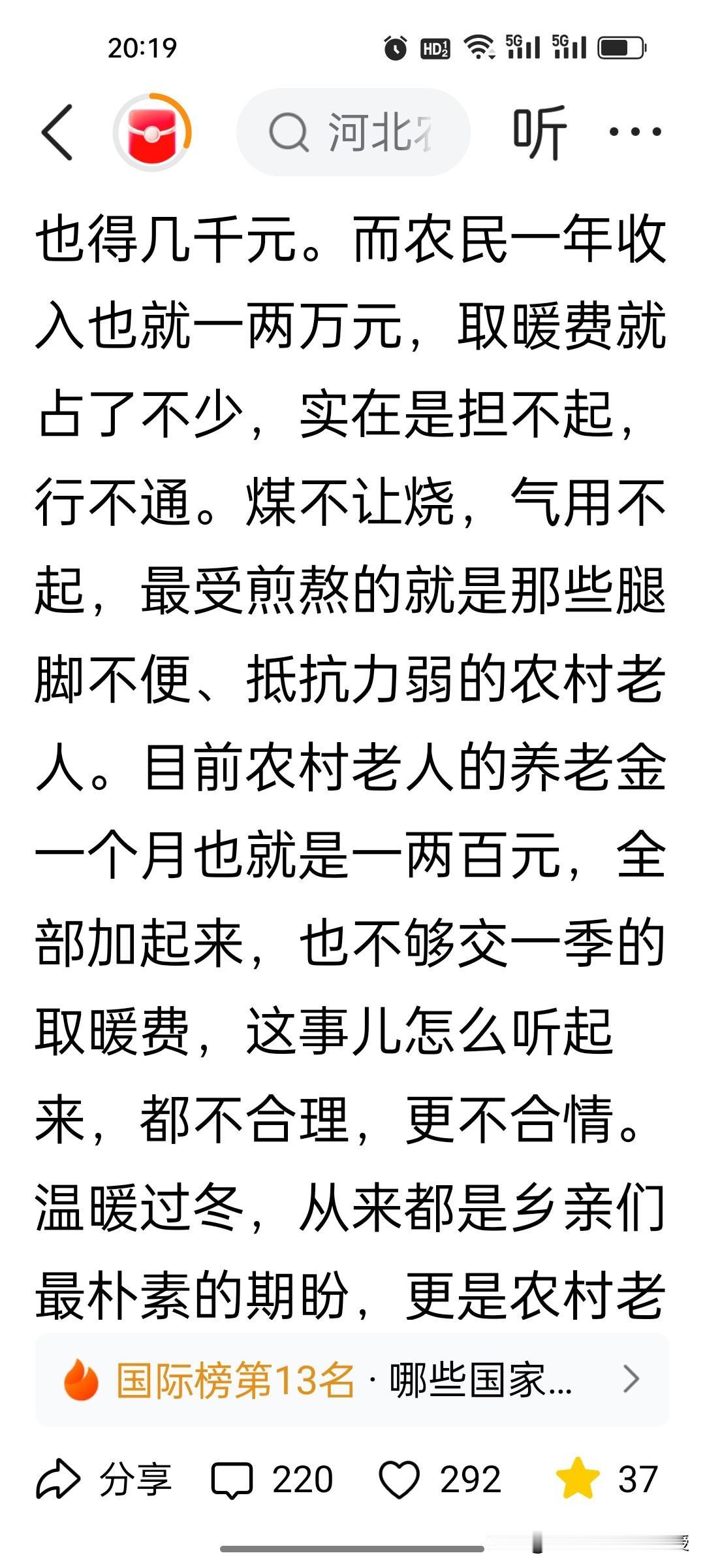 刚刚看到《农民日报》喊话了,真的不敢相信,河北农村老人取暖难,还寒了心! 这篇题为《河北农村取暖问题,不能再耽搁了》的文章,确实让人看到了河北农民的无奈啊!河北超1200万农村退休老人,月均养老金仅150元,却要面对每冬5000-10000元的取暖费,这反差太扎心! 文章有几个核心点:其一,煤改气后气价居高不下,补贴从1元/方骤降至0.2元,老人根本用不起;其二,养老金连取暖费零头都不够,寒冬里要么挨冻要么掏空积蓄;其三,取暖是基本民生需求,却成了农村老人的年度难题。 都2026年了,还有地方取暖难,如此民生痛点拖了近十年仍未解决,实在让人震惊!希望各地民政部门尽快出实招,让老人能温暖过冬,不能寒了人心啊!