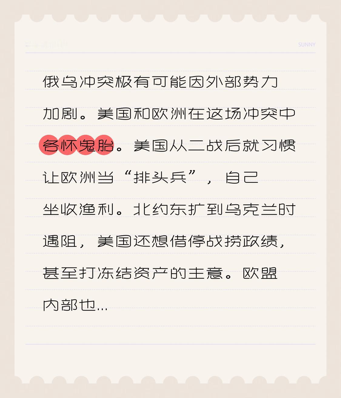 俄乌冲突极有可能因外部势力加剧。美国和欧洲在这场冲突中各怀鬼胎。美国从二战后就习惯让欧洲当“排头兵”,自己坐收渔利。北约东扩到乌克兰时遇阻,美国还想借停战捞政绩,甚至打冻结资产的主意。 欧盟内部也矛盾重重,为给乌克兰凑钱吵得不可开交,比利时怕担责,匈牙利和捷克不配合。乌克兰部分军人想恢复失地,不愿接受战败,还打算增强军事潜力继续作战。外部势力的不同诉求和干预,只会让俄乌冲突这潭水越来越浑,加剧冲突的可能性极大。