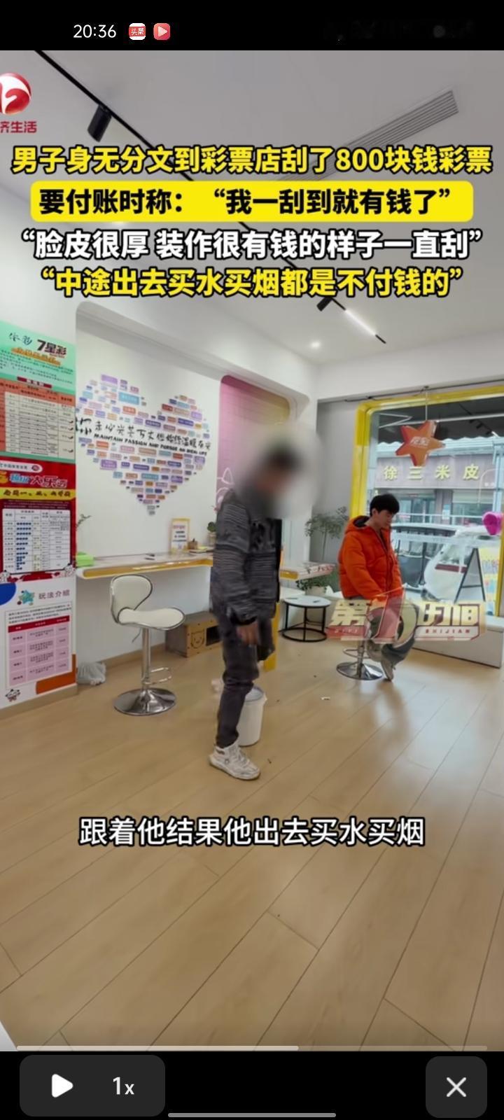 1月4日,许昌禹州市。一男子身无分文到彩票店刮了800元彩票,要付账时他说:”我一刮到就有钱了“,问及家人他却说“家人都死了” 彩票店老板陈女士称,他刮彩票一共有800多,中了300多,最后反正要付500元。他脸皮很厚,装作很有钱的样子一直刮,可能他上头了。其实他是一分钱都没有。他中途说他要出去,跟着他结果他出去买水买烟,他都是不付钱的,等于一进别人店先把别人的水打开先喝着,然后把人家的烟拿一包过来先打开抽着。警察一进来就认出他了,说他从许昌打出租车回来的,没付出租车的钱