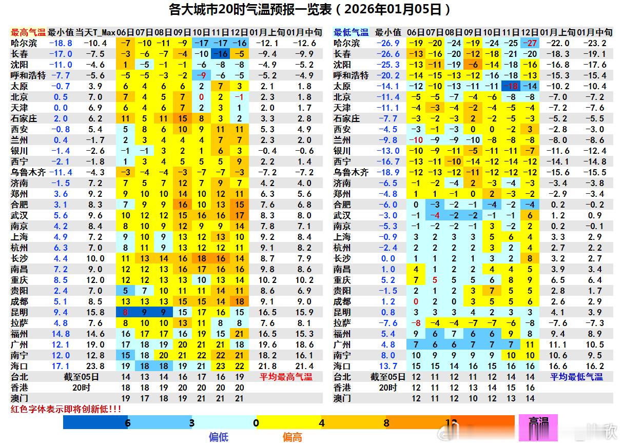 【气温】关注三个事情,一个是冷空气6日翻过乌蒙山进入云南东部,导致明显降温。9日以后冷空气回撤,云南东部回暖;一个是江南华南未来放晴后昼夜温差大,白天暖、夜间冷。穿搭衣服既要看最高气温,也要看最低气温。还有一个是,未来5天,东北气温起伏变化较大。今天昆明最高气温15.8℃,明天将降至8℃,一下变得阴冷不少。对应冷高压的1020百帕线明显向西推进。7-8日昆明还在1020百帕线控制内,继续阴冷。9日冷空气回撤,1020百帕线明显东退,云南东部大回暖(图3),昆明最高气温回到15℃,10日最高17℃,气温基本回归正常。明天江南华南多地的昼夜温差,大多还不到10℃。但7-8日的昼夜温差基本都会拉大到10℃以上,9日甚至会看到15℃以上的昼夜温差。比如合肥9日最低零下1℃、最高16℃,一天温差17℃。武汉类似,温差也有17℃,最低零下2℃、最高15℃。东北地区未来5天将经历升温-降温-升温-降温的来回变换。冷暖空气如同跑马灯,匆匆而过。算上今天和未来5天,东北三个省会的最高气温的起伏情况——哈尔滨零下10.4℃-零下7℃-零下11℃-零下9℃-零下17℃;长春零下7.5℃-零下3℃-零下7℃-零下4℃-零下10℃;沈阳零下4.6℃-零上1℃-零下5℃-零下1℃-零下6℃。