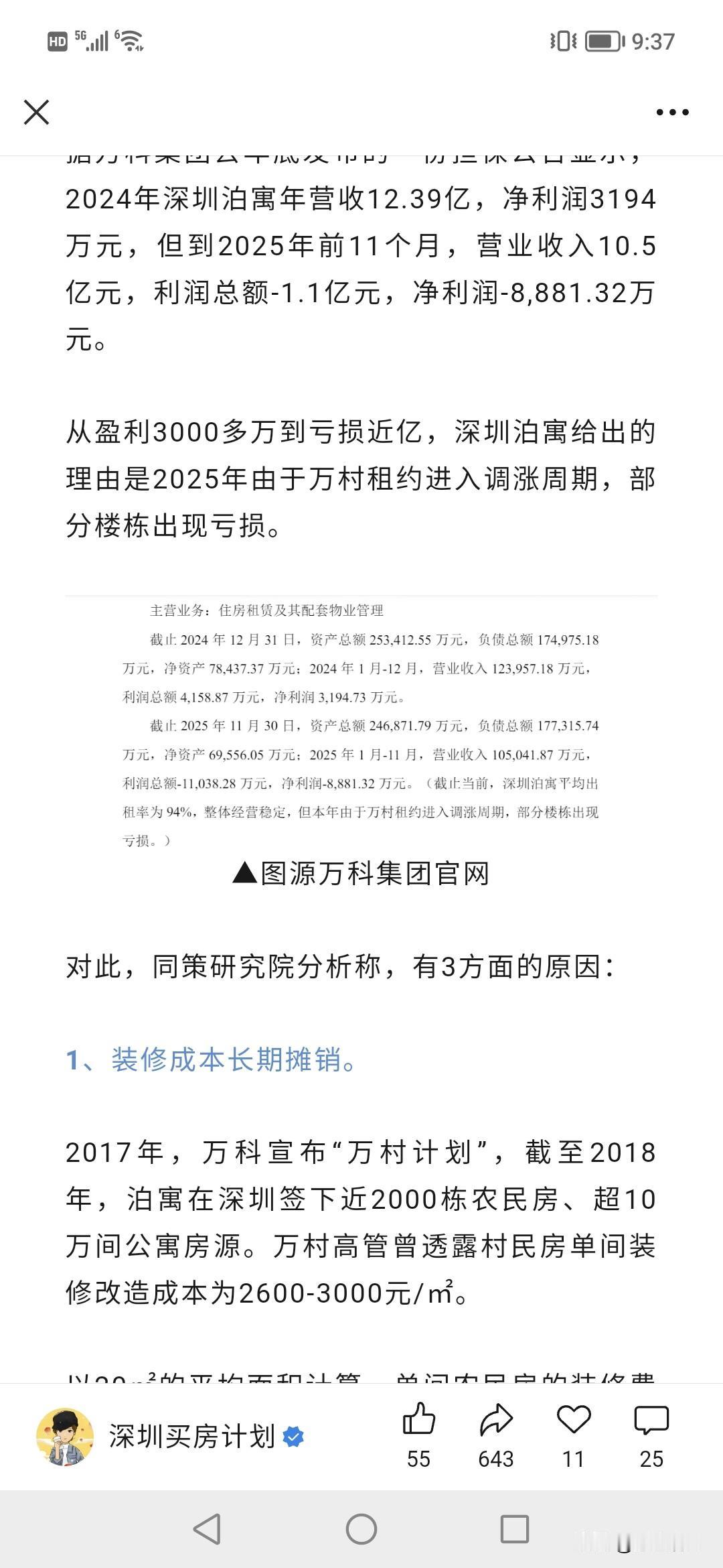 深圳长租公寓亏钱了?!万科泊寓说去年2025前11月收入10个亿,亏了1个多亿,利润负八千多万,可是2024年万科泊寓收了12个亿,赚了三千多万。。!因为收房太多,成本多了。?!现在长租公寓很多收费,总是每个月多200元其他收费。深圳万科物业 深圳