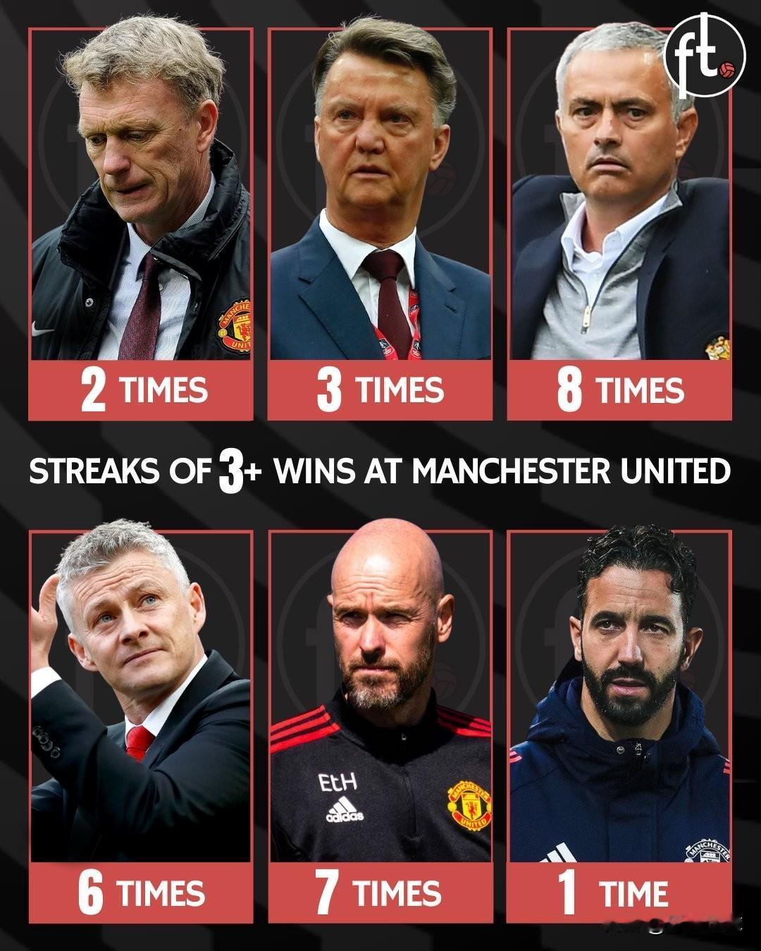 阿莫林在曼联面临的核心问题在于稳定性和势头。(滕哈格也差不多) 每当球队看似步入正轨时,他们就会输掉或踢平本该赢下的比赛。 自弗格森爵士离开俱乐部以来,穆里尼奥是取得最多3场及以上连胜的主教练: 🏴 莫耶斯 — 2次 🇳🇱 范加尔 — 3次 🇵🇹 穆里尼奥 — 8次 🇳🇴 索尔斯克亚 — 6次 🇳🇱 滕哈格— 7次 🇵🇹 阿莫林 — 1次