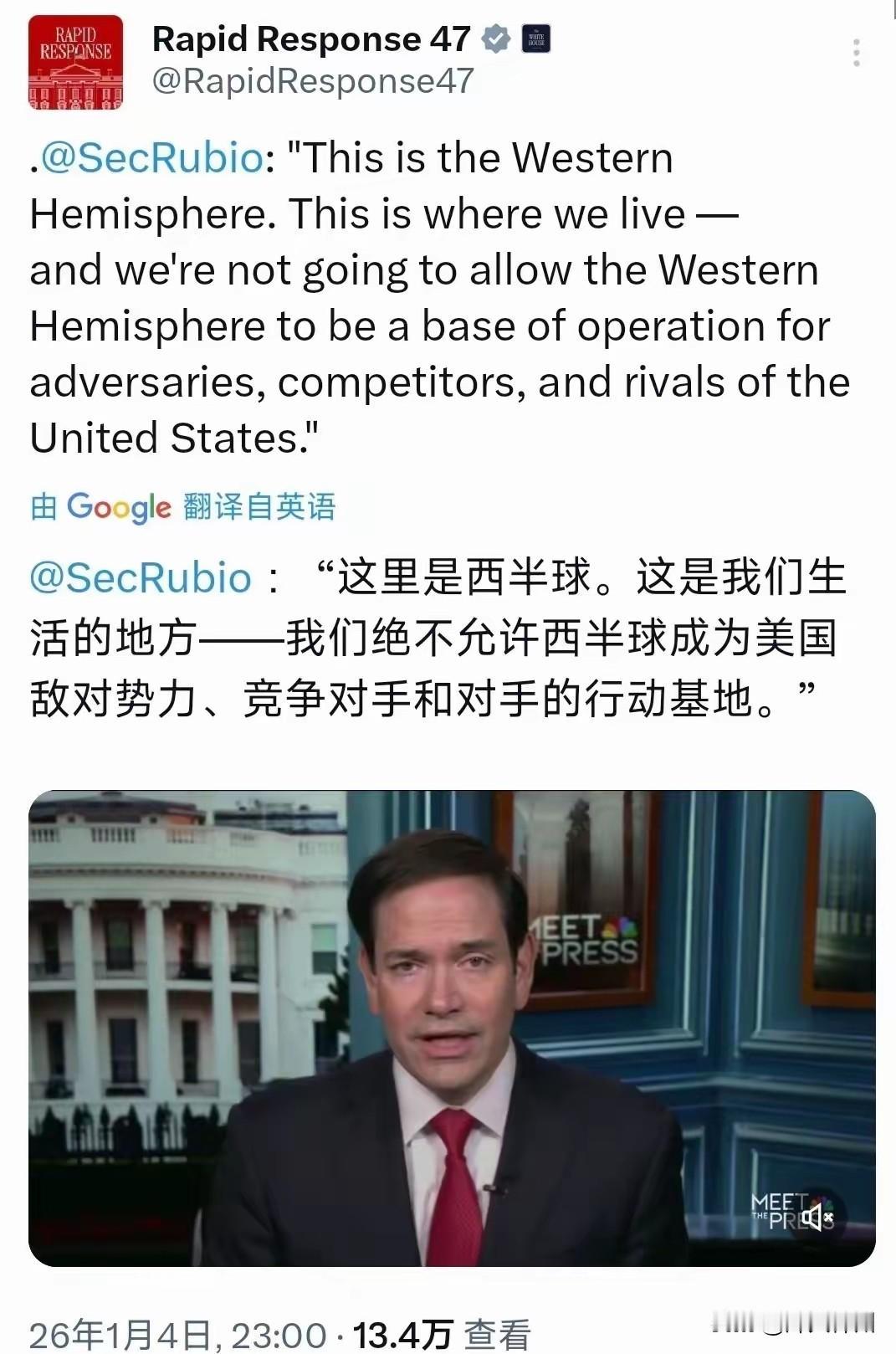 1月4日,美国官员鲁比奥公开发表针对西半球的强硬言论, 鲁比奥称,西半球是美国的生活区域,美方绝不允许该地区成为美国敌对势力、竞争对手及对手的行动基地。 评几句: 这一表态并非新鲜论调,更像是19世纪“门罗主义”的当代延续,核心逻辑仍是强调自身在西半球的特殊地位,将其他国家的正常合作与交流,简单等同于对区域秩序的“威胁”。 鲁比奥此番强硬发声的时间点,恰好处于拉美地区多国推动自主外交、强化区域合作的敏感阶段。这种表态的背后,不难看出其试图通过强调“区域主导权”,向拉美国家传递外交信号的意图。 值得注意的是,鲁比奥在相关表述中,明确提及不希望部分域外国家在西半球开展合作。这一说法,与国际社会公认的自由贸易、平等合作原则相悖——毕竟任何主权国家,都有权根据自身发展需求选择合作伙伴,这是不容干涉的基本权利。 这种以意识形态和地缘利益划线、搞排他性对抗的做法,不仅违背了国际关系基本准则,也容易引发拉美国家的警惕与反感。历史早已证明,靠单边施压和强权逻辑维系的所谓“秩序”,终究难以持久。当一方试图通过划定“势力范围”维护自身优势时,实际上是在背离多极化的时代潮流,加速自身在国际合作中的孤立。 西半球的未来,属于生活在这片土地上的所有国家和人民,而非由单一国家的意志所决定。鲁比奥的这番言论,或许能契合部分单边主义的主张,但绝不可能阻挡世界多极化和国际关系民主化的时代洪流。关于美洲未来发展方向的讨论,正随着各国主权意识的提升逐步展开。