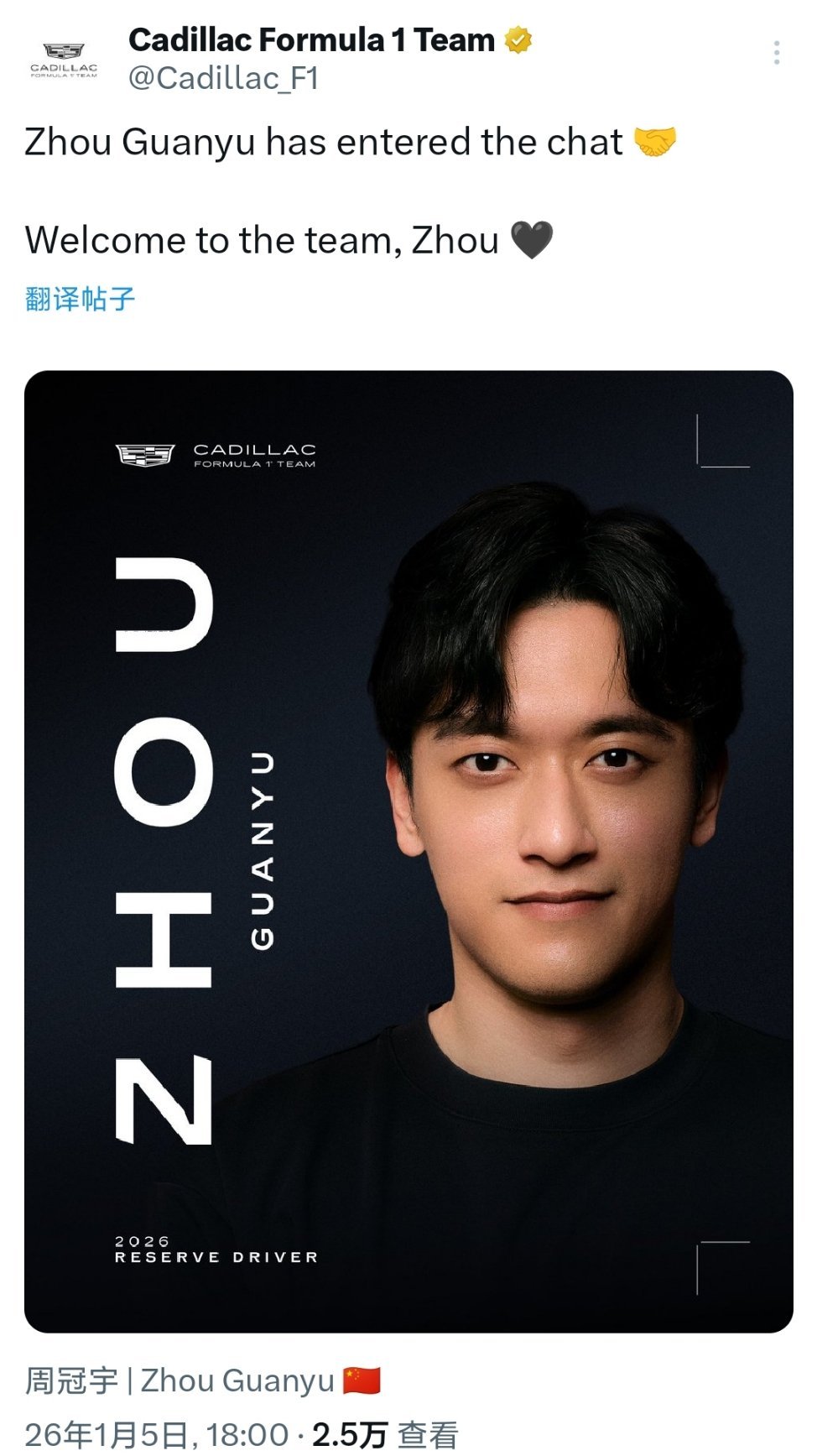 中国🇨🇳车手周冠宇将从2026赛季起加入凯迪拉克F1车队担任储备车手!F1赛车凯迪拉克周冠宇加盟凯迪拉克周冠宇成为凯迪拉克储备车手