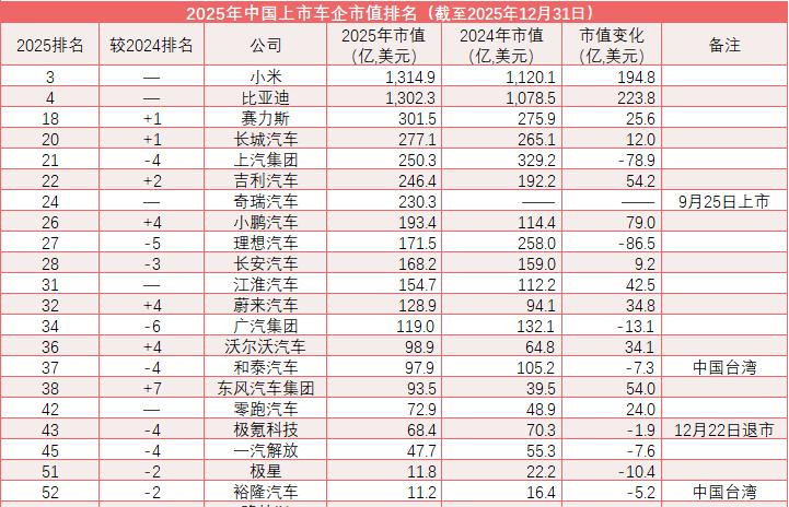 小米守不住第三?比亚迪销量猛追 1月5日,全球车企市值榜定格到2025年12月31日。前四不变,特斯拉、丰田、小米、比亚迪。 雷军1月3日直播称,2026年主攻汽车,目标55万辆,2025年已交付超41万辆。小米Q3营收1131.2亿元,同比+22.3%,净利113亿元,同比+80.9%,创新业务单季赚7亿元。资本看生态溢价,小米估值压过比亚迪。 比亚迪1月4日报2025年销量460.2万辆,同比+7.73%。纯电225.67万辆,胜特斯拉164万辆。市值1302.3亿美元,紧追小米的1314.9亿美元。 往前看,L3商业化成2026年估值新锚。12月31日赛力斯拿到L3测试牌照,上汽推进准入。态度清楚,故事要响,数据更要硬。