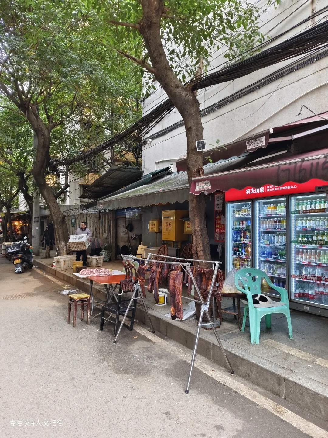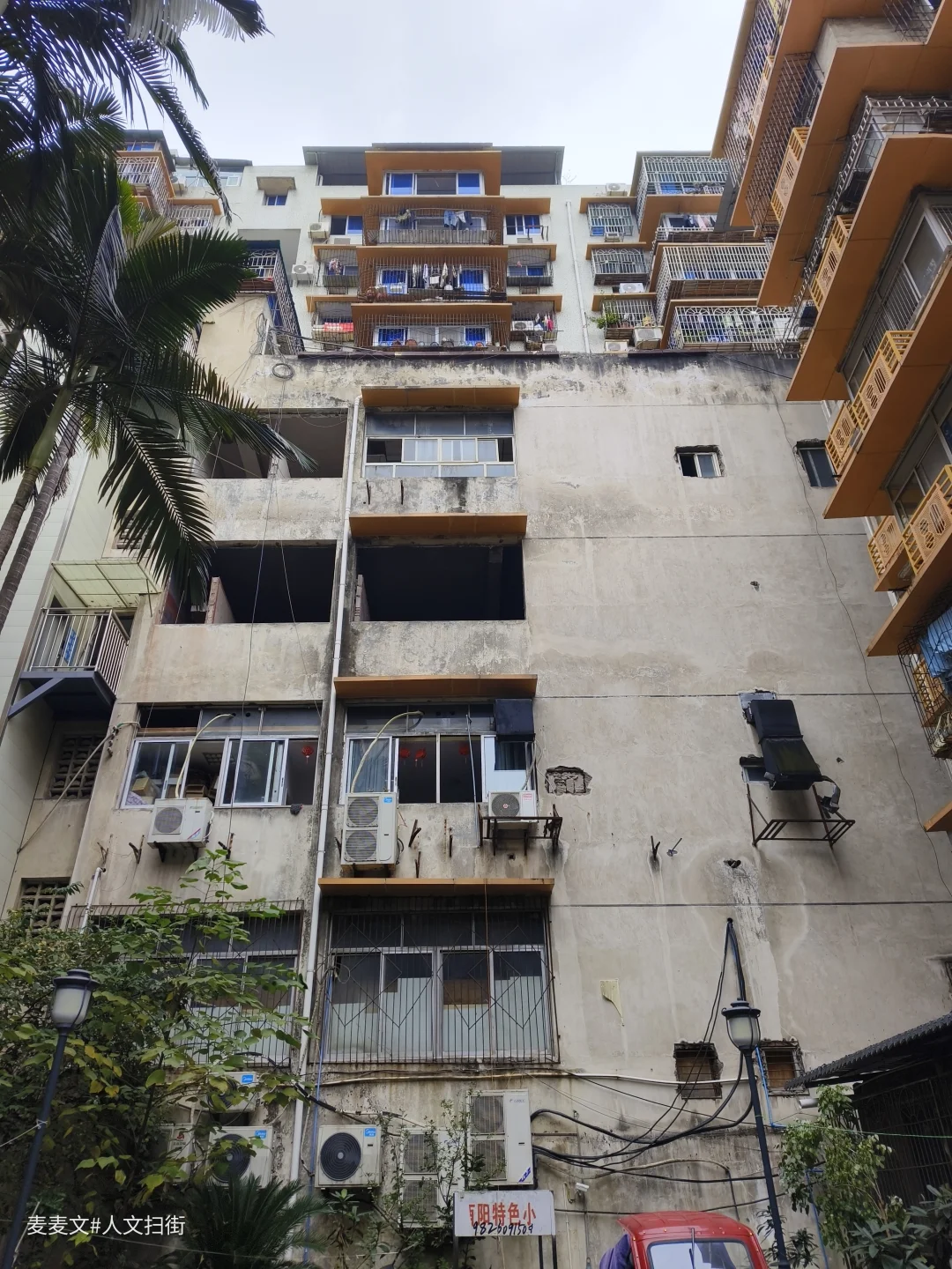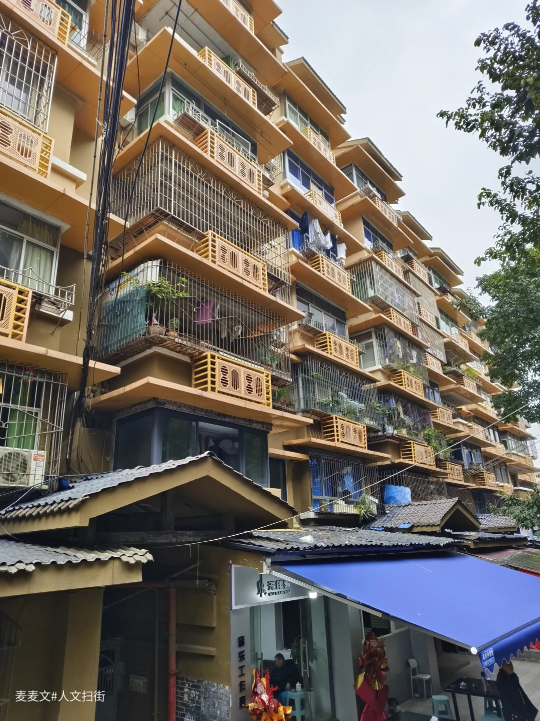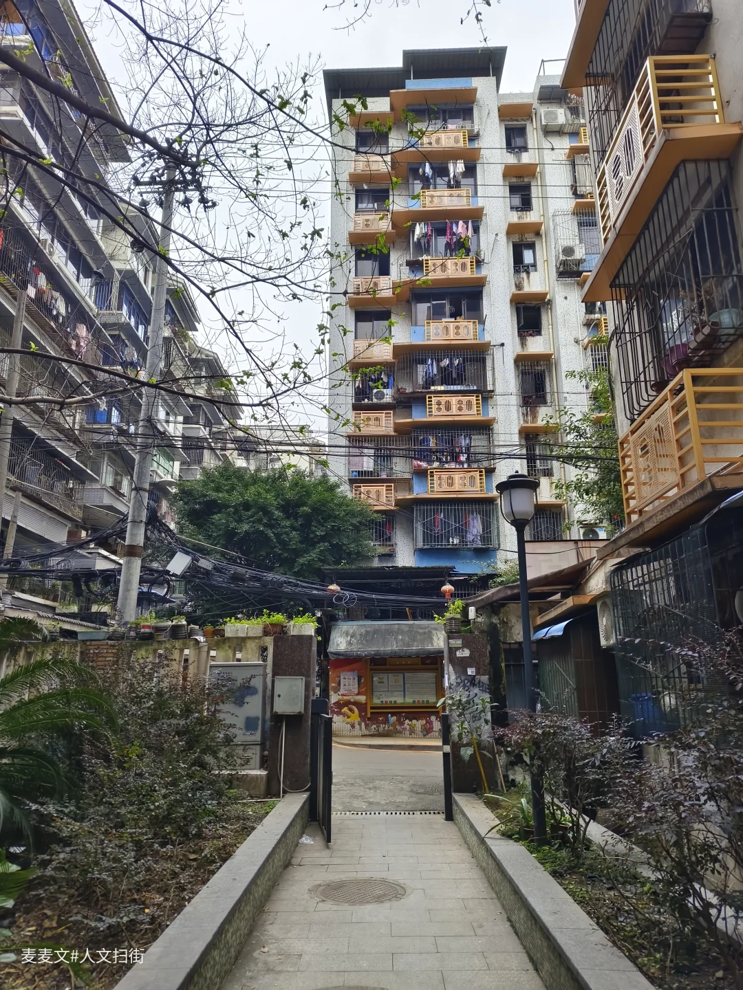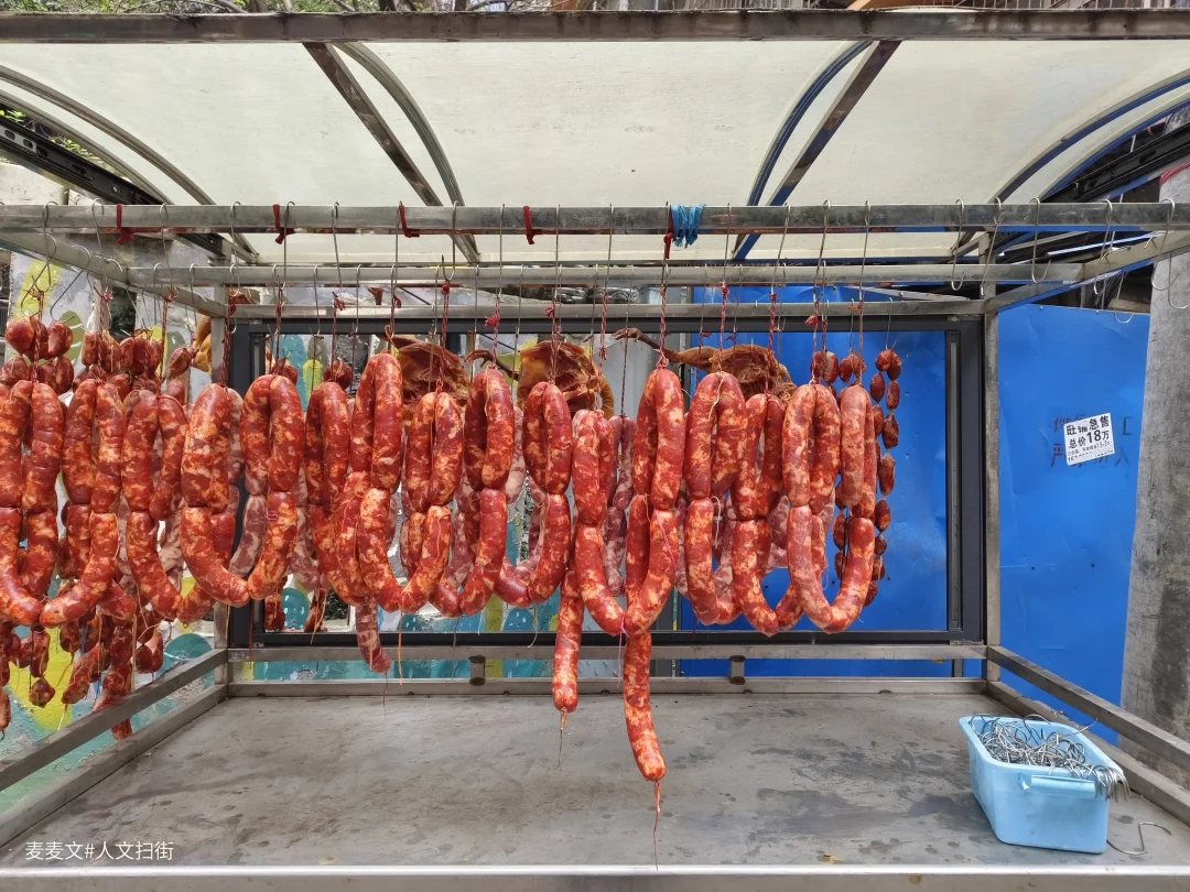 走进家属院,石柱上“原珞璜电厂职工家属院”的绿色标识牌格外醒目。斑驳的居民楼外墙、交错的管线与橙黄色阳台支架,刻着岁月的痕迹。巷子里的绿植、居民摆的盆栽,又添了几分生活暖意。街边悬挂的香肠腊肉,是重庆冬日独有的烟火,拄杖慢行的老人,让老小区的闲适氛围更浓。