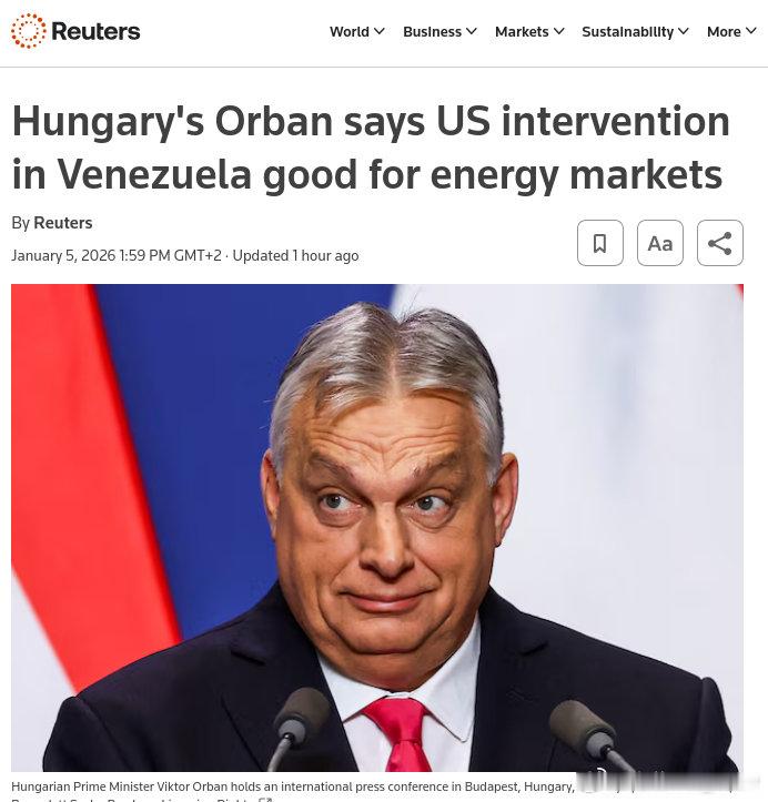 匈牙利总理欧尔班表示,美国干预委内瑞拉对能源市场有利。“我认为对匈牙利来说,重要的是,据我估计,美国加上委内瑞拉,将能够控制世界40-50%的石油储量,”欧尔班在面向国际媒体的年度新闻发布会上说。“委内瑞拉已经具备对世界能源市场价格产生重大影响的能力……我认为,控制委内瑞拉后,匈牙利很有可能获得更有利的全球能源形势,这是个好消息。”