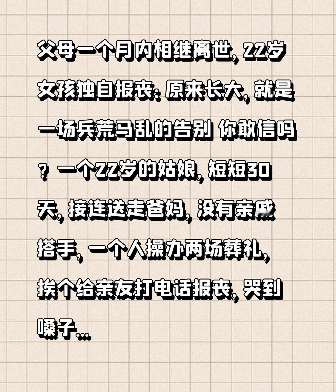 父母一个月内相继离世,22岁女孩独自报丧:原来长大,就是一场兵荒马乱的告别 你敢信吗?一个22岁的姑娘,短短30天,接连送走爸妈,没有亲戚搭手,一个人操办两场葬礼,挨个给亲友打电话报丧,哭到嗓子沙哑,却还要强撑着处理后事。 这事就发生在河南洛阳。女孩小夏原本有个普通却幸福的家,爸妈做点小生意,日子平淡安稳。可命运的暴击来得猝不及防,上个月初,爸爸突发心梗,没来得及说一句话就走了。小夏哭到晕厥,妈妈抱着她一遍遍念叨“还有妈呢”。她以为,只要守着妈妈,日子就能慢慢好起来。 谁能想到,这竟是命运设下的残忍转折点。爸爸的后事刚办完,妈妈就因为过度悲痛加上长期劳累,突发脑梗住进ICU。小夏白天跑医院缴费、签字,晚上守在病床前,握着妈妈的手说话,盼着奇迹出现。可半个月后,妈妈还是永远离开了她。 短短一个月,天塌了两次。小夏翻着手机通讯录,看着那些熟悉的名字,却不知道该先打给谁。她擦干眼泪,深吸一口气,一个一个拨过去:“叔叔,我爸走了”“阿姨,我妈也不在了”。电话那头的叹息和安慰,像一根根细针,扎得她心口生疼。 葬礼上,她穿着黑衣,挺直脊背,招呼前来吊唁的亲友,给每个人鞠躬道谢。没人知道,她转身的瞬间,眼泪就砸在了衣襟上。整理爸妈遗物时,翻出一沓沓泛黄的照片,还有藏在衣柜深处的存折,上面是爸妈省吃俭用攒下的、准备给她当嫁妆的钱。那一刻,她再也忍不住,抱着照片号啕大哭。 有网友说:“看着她,就像看到了曾经的自己。”是啊,我们总以为长大是慢慢的,可有时候,长大就是一瞬间的事。是你不得不独自面对风雨,不得不扛起所有重量。 小夏说,她会好好活着,替爸妈看看这个世界。因为她知道,爸妈的爱,从来没有离开过。 其实我们每个人,都在被父母庇护着长大。可终有一天,我们要学着自己撑伞。愿我们都能珍惜和父母相处的时光,也愿那些独自扛过风雨的人,都能被世界温柔以待。 你有没有过突然觉得自己长大了的瞬间?