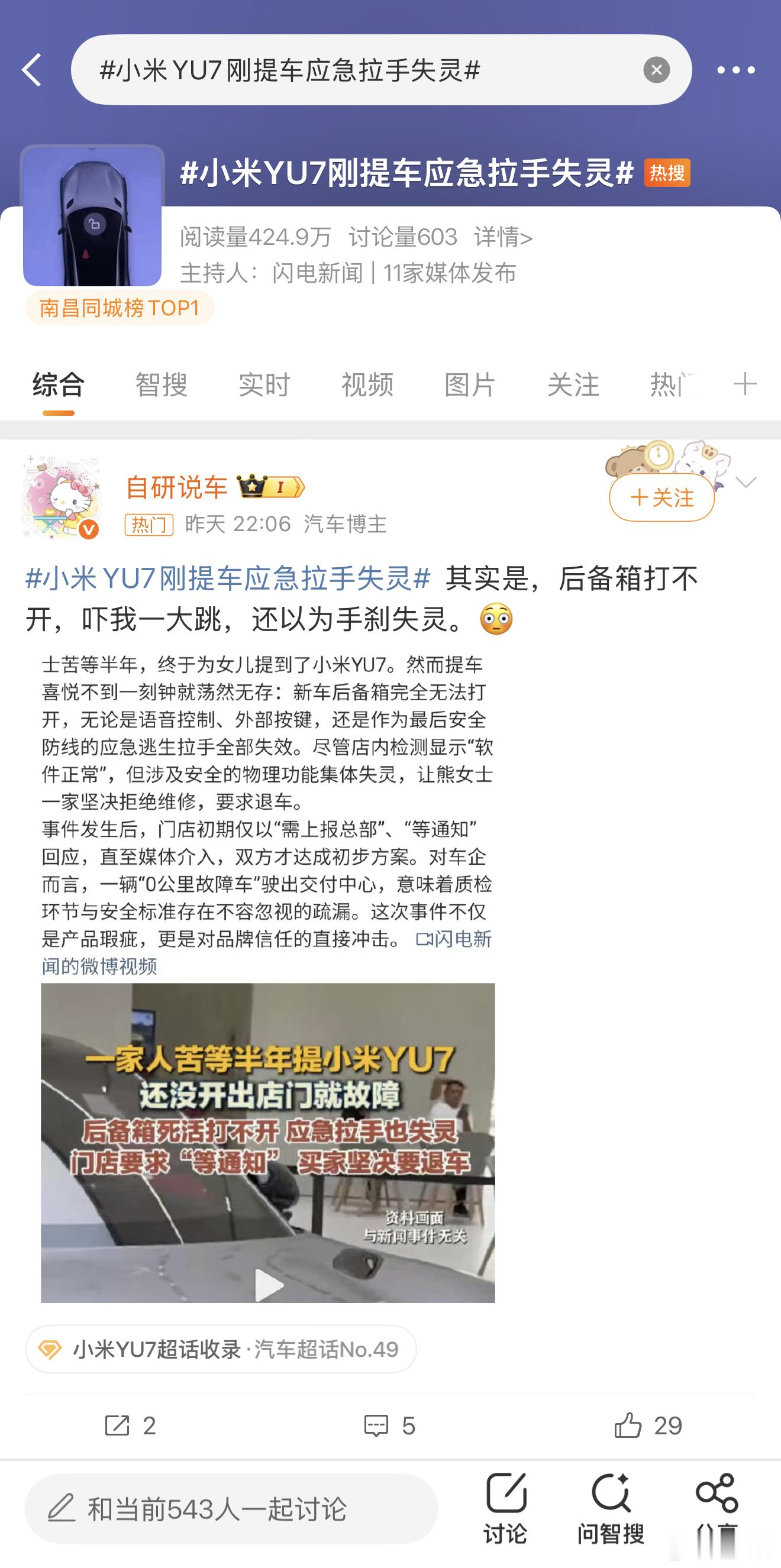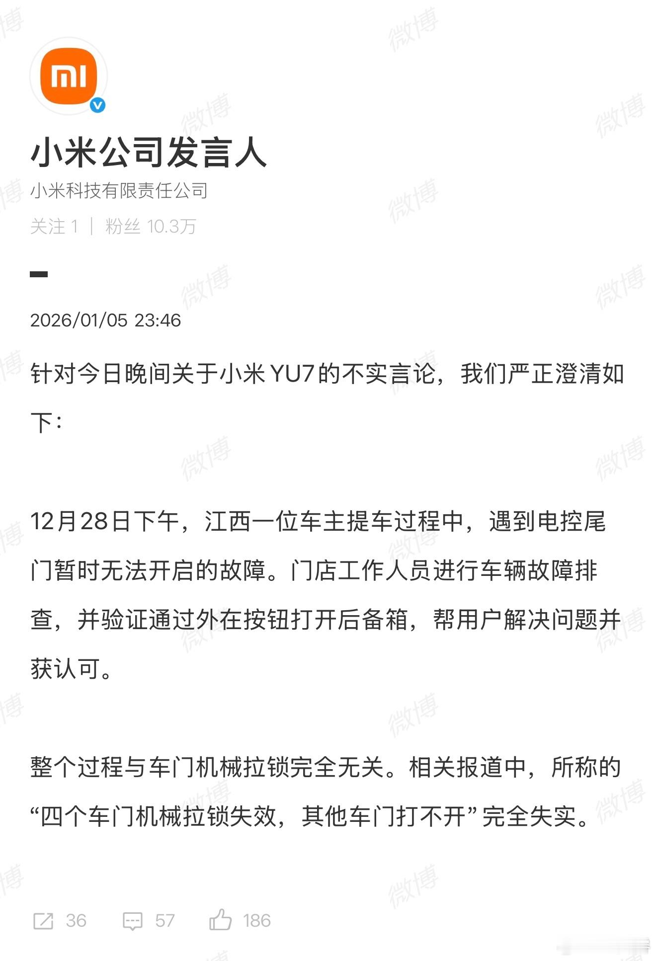 小米公司发言人回应今晚关于 YU7 的不实言论12.28 下午江西一位车主提车时遇到尾门开启故障门店工作人员迅速排查,解决问题并获车主认可过程与机械拉手无关,那这个热搜 是不是应该查查怎么回事?毕竟好多人都被误导,以为是手刹 / 应急拉手失灵另外这次事情还没发酵小米就回应了,不错 继续保持
