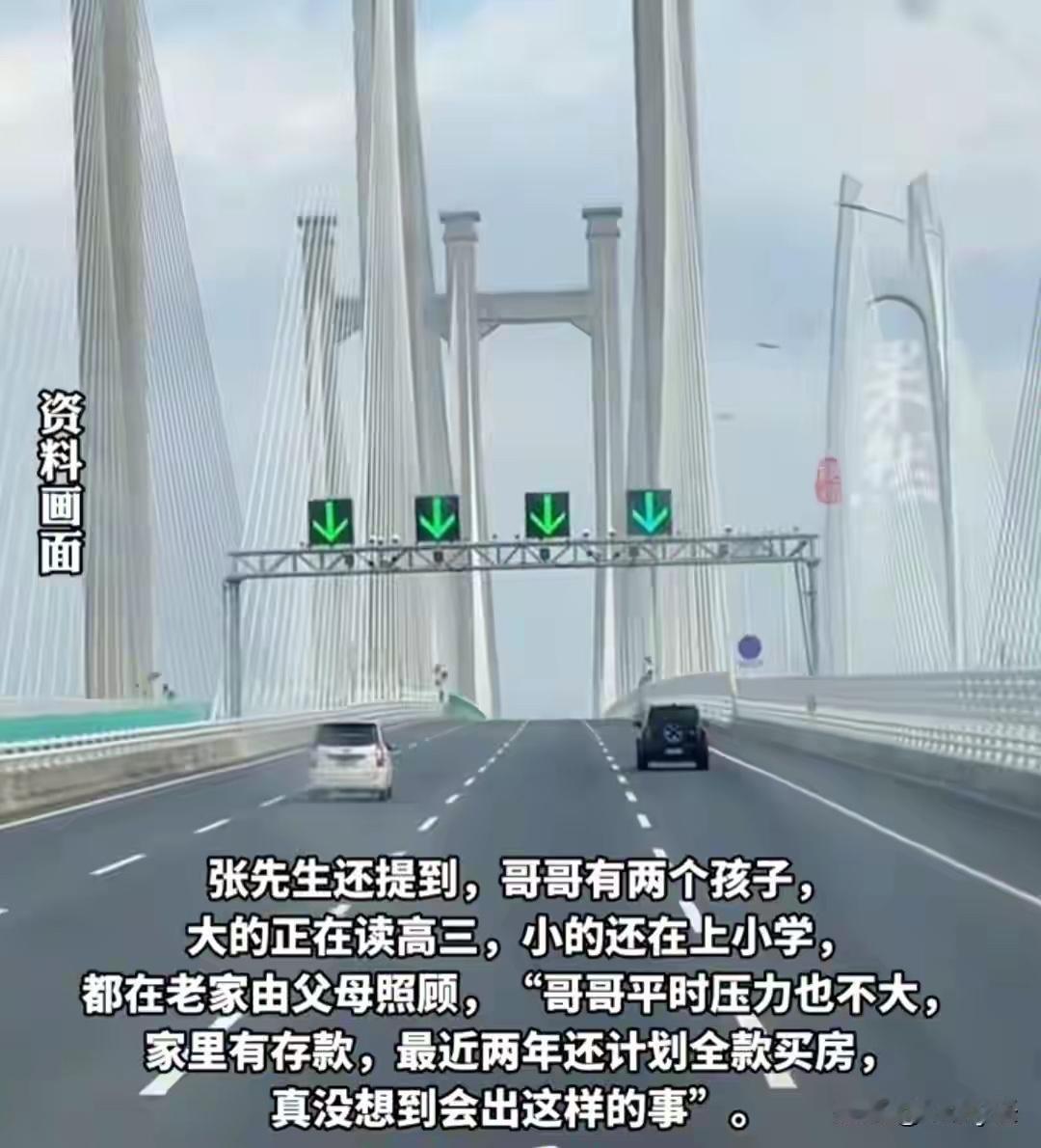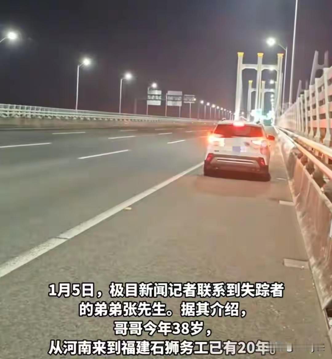 1月4日,张先生的家人发布紧急寻人启事找哥哥,其告知哥哥在1月1日晚上十一点多福建泉州湾跨海大桥弃车失踪了。海面和桥下小岛都找了,都没有发现张先生的踪影,真是令人着急。希望张先生只是想一个人出去静一静,希望他不要做傻事,夫妻之间磕磕绊绊很正常,不要因为一件小事就做出让人肝肠寸断的傻事! 有网友表示:一个男人娶上通情达理的妻子是最大的福分,如果娶下一个胡搅蛮缠,不近人情的,那是最大的悲哀。 其实他也不愿意这样。尤其今年大环境不好。压力大。男人的肩膀特别的重。希望看到此信息的姐姐妹妹们多理解一下。 女人在家不可强势对男人的关爱也很重要,也可能是日久天长积下的怨气而造成的不测吧! 车停在跨海大桥上,人却不见了!再加上他发给妻子的那句话,说明他当时的情绪很低落,大家认为他还有找回来的希望吗?虽然我们都不想看到悲剧的发生,但这种事情往往是不以人的意志为转移的。 对此大家怎么看呢