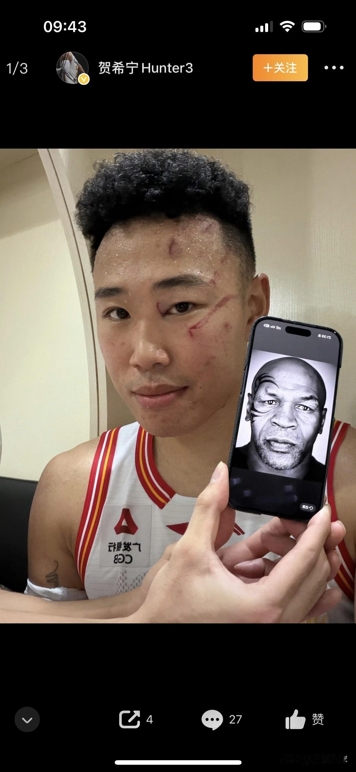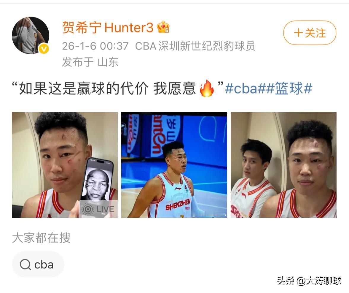 硬汉!贺希宁1月5日遭青岛吕俊虎“毒手”!CBA常规赛第十一轮,深圳92-83大胜,青岛本场比赛状态不佳,深圳球员贺希宁首节抢篮板时面部意外受伤。在赛后贺希宁发布社媒,并晒出伤痕图片并写道:“如果这是赢球的代价 我愿意”,硬汉!深圳避雷针