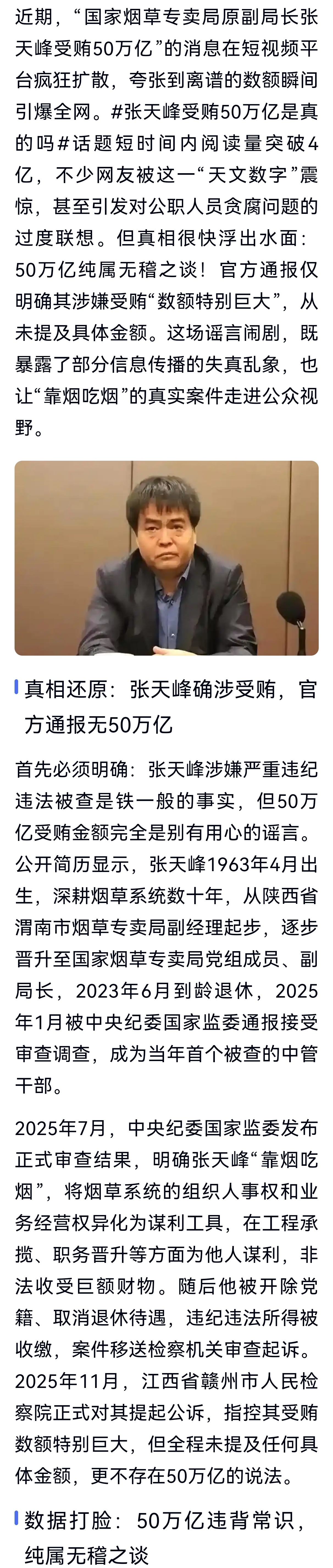 秦岭笑谈 【张天峰受贿50万亿太离谱,这种一眼假的新闻为什么有人会信?】首先必须明确: 张天峰涉嫌严重违纪违法被查是铁一般的事实,但50万亿受贿金额完全是别有用心的谣言。张天峰受贿50万亿是真的吗 话题上了热搜,不少网友被这一"天文数字"震惊,甚至引发对公职人员贪腐问题的过度联想。但真相很快浮出水面:50万亿纯属无稽之谈!官方通报仅明确其涉嫌受贿"数额特别巨大",从未提及具体金额。这场谣言闹剧,既暴露了部分信息传播的失真乱象,也让"靠烟吃烟"的真实案件走进公众视野。