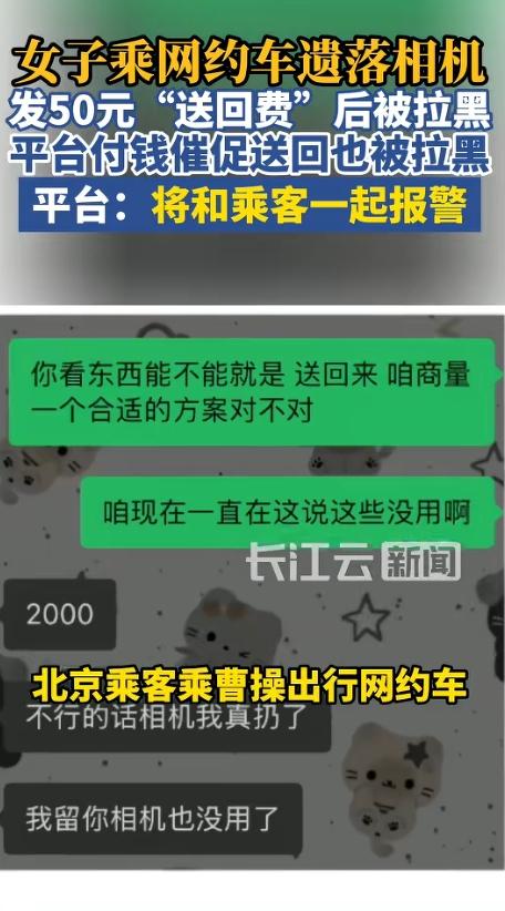 “真是贪心!”北京,一女子打网约车,不小心把相机落在车上了。女子发现后马上给司机打电话,司机向女子要100元钱,女子当即给对方转过去50,并承诺相机送回时,再给50元。谁知,对方收了钱就将女子拉黑了。女子向平台投诉。第二天,司机打来电话,上来就说帐号封了,让女子赔偿他2000元误工费,还威胁不给就把相机扔了。接下来发生的事更是刷新了下限。   女子乘坐网约车抵达目的地后,下车时因疏忽大意,将随身携带的相机遗落在了车辆座位上,直到离开车辆后才发现物品丢失。   情急之下,她迅速联系上了接单的网约车司机,希望能取回相机,沟通中,司机主动提出,需女子支付100元费用才愿意帮忙归还相机。   女子为尽快拿回物品,当即同意了这一要求,先通过转账向司机支付了50元,并明确承诺,等司机将相机送达指定地点、自己确认收到后,再补足剩余的50元。   本以为双方达成共识后相机能顺利取回,可令人始料未及的是,司机收到50元转账后,态度瞬间转变,不仅没有提及归还相机的具体安排,反而直接将女子的联系方式拉黑,彻底切断了双方的沟通渠道。   无奈之下,女子只能向该网约车所属平台提交投诉,说明自己遗失物品及被司机拉黑的情况,平台核实相关信息后,迅速对该司机的运营账号采取了封禁处理,限制其继续接单运营。   次日,被封号的司机主动致电女子,电话接通后便情绪激动地将账号被封的责任归咎于女子,以无法接单营生为由,强行要求女子赔偿2000元误工费。   同时还出言威胁,声称若女子不按时支付这笔费用,就将她的相机随手丢弃,试图通过恐吓手段逼迫女子妥协。   有网友说,拾金不昧是最基本的做人底线,就算想要些跑路费,好好商量也不是不能理解,可收了钱就拉黑,转头还狮子大开口威胁人,这根本不是贪心,是纯粹的坏。   也有网友吐槽,乘客自己丢东西是疏忽,但这绝不能成为司机趁火打劫的理由,2000元误工费纯属漫天要价,真把别人的着急当自己敛财的机会了。   乘客主动愿意给钱,是客气、是感谢,不是义务,就算司机为了还相机产生了交通费、耽误了接单,合理提些补偿,乘客大概率也愿意承担,但前提是坦诚沟通、互相体谅。   可这位司机倒好,一步错步步错,收了定金就翻脸,账号被封是自己违法失德的后果,却反过来逼乘客买单,这种逻辑简直荒谬至极。   网约车司机靠接单谋生,账号就是饭碗,可他偏偏为了眼前的小利,亲手砸了自己的饭碗,还可能惹上法律麻烦,这种赔本买卖,纯属自找的。   对网约车平台来说,封号只是事后补救,更该在司机入驻时严格审核人品素质,日常多做职业素养培训,明确遗失物品的处理流程,真出了纠纷也能及时介入调解,帮双方合理维权,而不是只把责任推给司机和乘客。   对我们普通人来说,丢了东西肯定着急,但一定要先联系平台留存证据,别私下和对方纠缠,避免被拿捏;要是捡到别人的东西,也别动歪心思,坚守底线才不会惹祸上身。   说到底,各行各业都该有职业操守,网约车司机靠服务赚钱,诚信才是长久的饭碗,没了诚信,再能接单也走不长远。 信息来源:长江云新闻