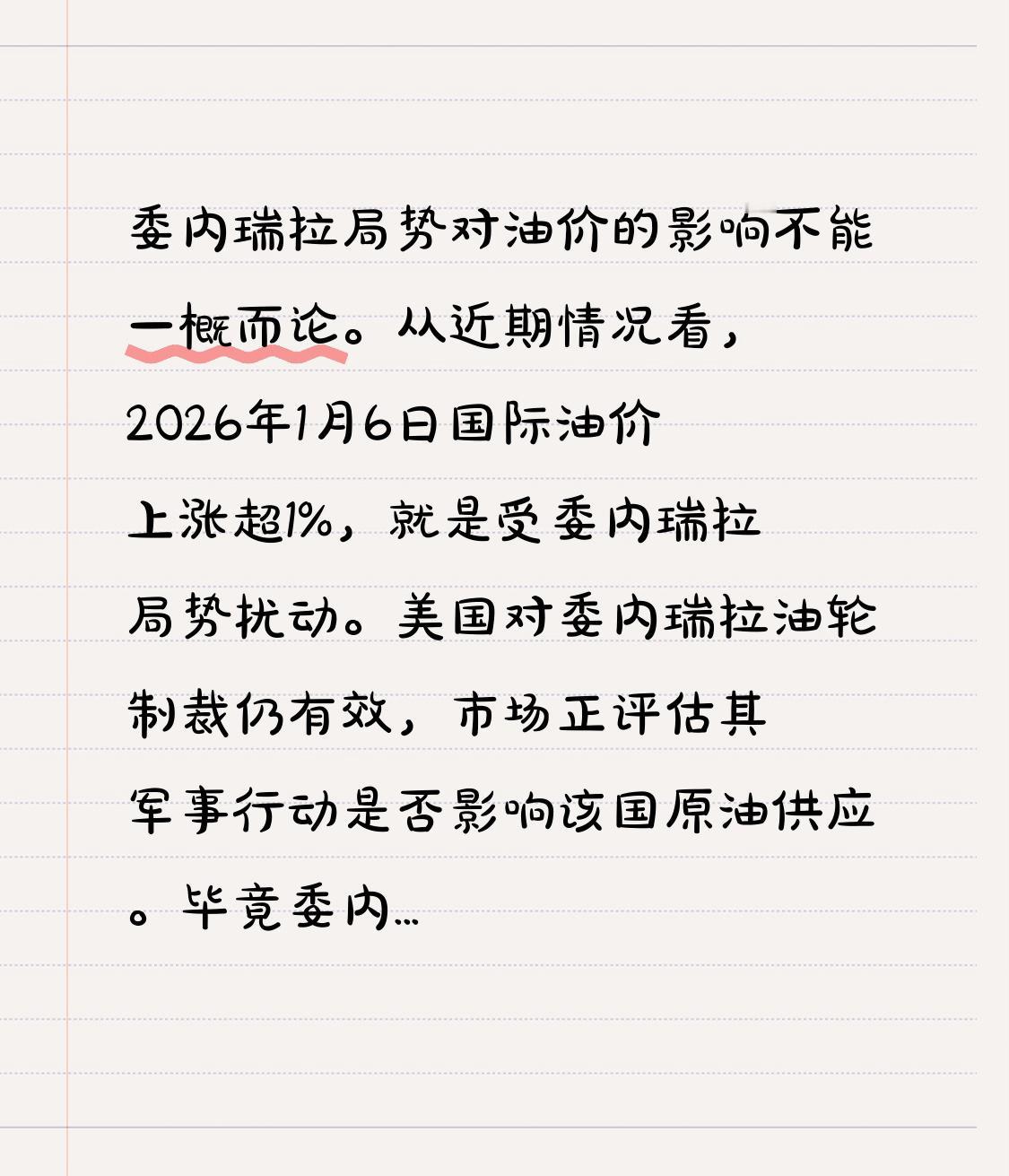 委内瑞拉局势对油价的影响不能一概而论。从近期情况看,2026年1月6日国际油价上涨超1%,就是受委内瑞拉局势扰动。美国对委内瑞拉油轮制裁仍有效,市场正评估其军事行动是否影响该国原油供应。毕竟委内瑞拉有全球最大已探明石油储量,还是OPEC成员国,其原油出口变化对国际油价影响重大。 但换个角度,1月3日美国突袭委内瑞拉,宣称接管石油产业,对油价提振却有限。近年来委内瑞拉受诸多因素影响,石油仅占国际供应1%左右,目前产量100万桶/日,远低于沙特、俄罗斯等。全球原油供给宽松,所以短期内局势对油价影响不大。