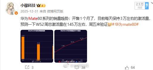 截止W52周,不知名第三方数据,华为Mate80系列国内市场激活量大概146万,和我预测145万基本一致2025年华为Mate80系列突破150万已经板上钉钉了,这个成绩大家觉得如何?华为Mate80系列销量曝光