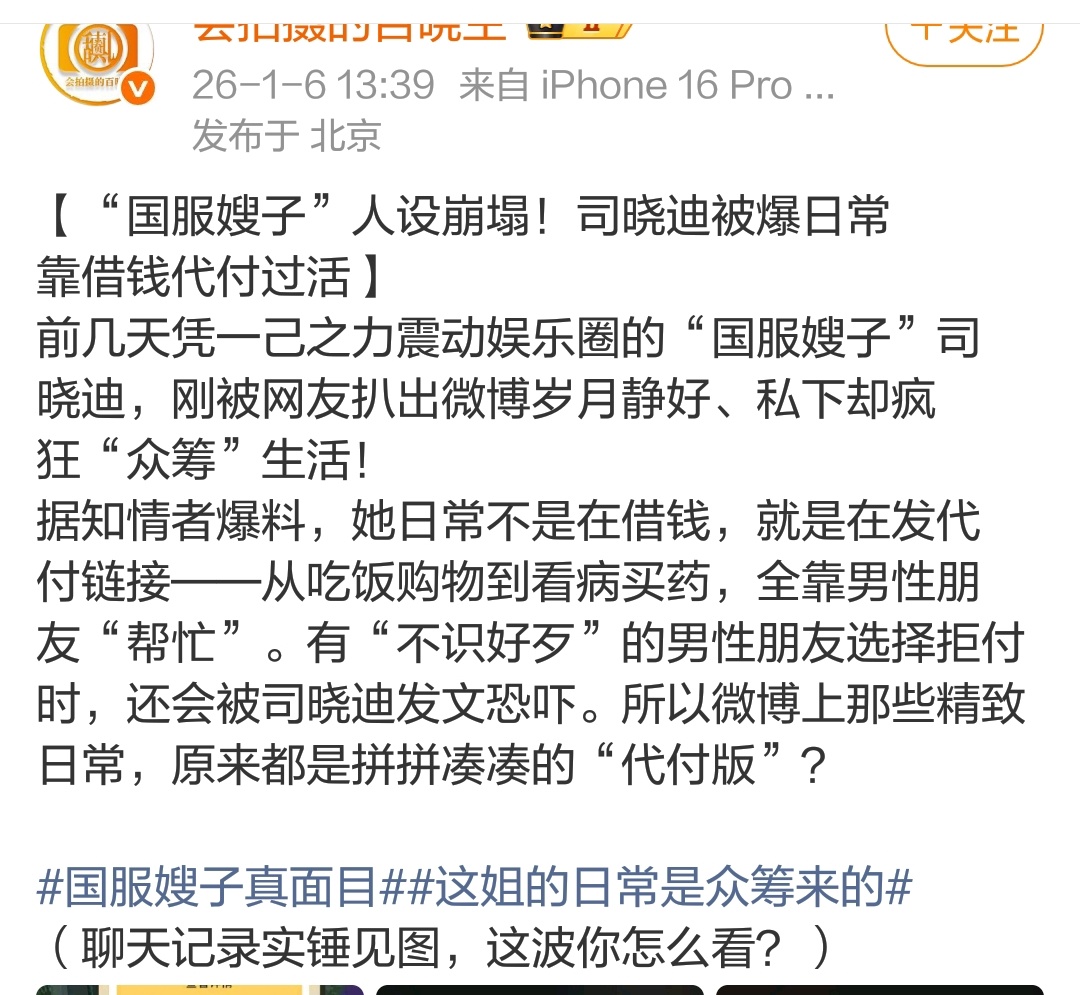 看狗仔爆料司晓迪,说她同一时间会跟不同男人找理由要钱,日常买东西都要不同富哥给报销,是直接发付款链的那种要,不给的话就骂富哥 。。狗仔说钱都要到了,那你这不是一个愿打一个愿挨,你不喜欢人家要你不给不就行了。。。