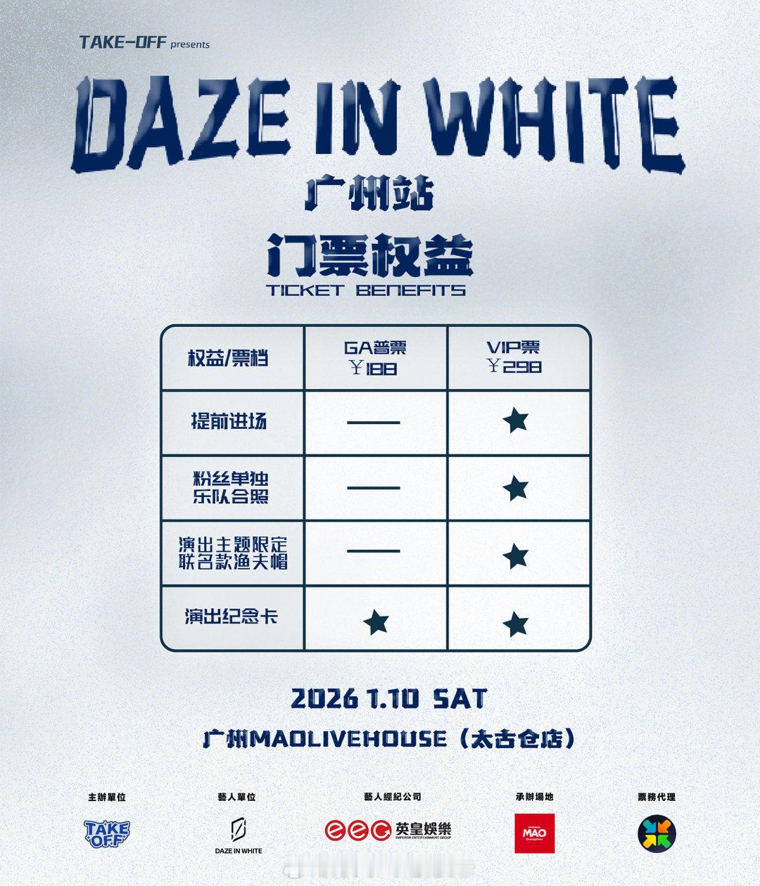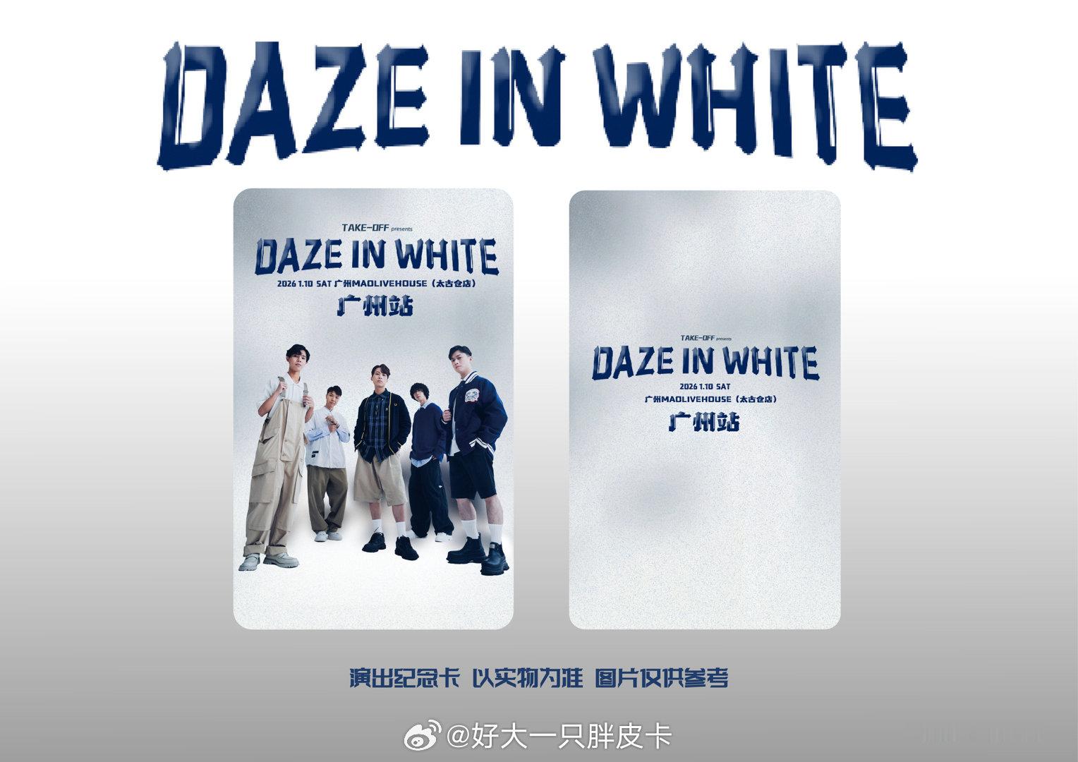 英皇娱乐旗下、来自中国澳门的乐队DAZE IN WHITE即将于本周六(1月10日)在广州开唱了!在风格快速更替、情绪不断被压缩的当下,DAZE IN WHITE 选择用一次完整而集中的现场,重新建立起人与音乐之间的连接。2026 年的第一个专场,他们把起点放在广州——一座对新声音保持敏感、也愿意为真实情绪停下脚步的城市。DAZE IN WHITE 的音乐,常常有在白色里游走的迷惘与清醒,他们的音乐记录了很多生活里的真实样貌,有城市工作的焦虑、深夜的压力、日常的鼓舞、小人物的坚持……他们并不急于给作品贴上明确标签,而是通过Band化层层推进的编曲、克制与持续累积的情绪,把听众带入一种介于失重与沉静之间的状态。这种状态的反映从不是炸裂型的冲击,而是一种持续的后劲,在看完演出后仍会留在身体里的那种震动。年轻一代乐队里,DAZE IN WHITE 的现场有着他们的不可替代性。DAZE IN WHITE 广州站,是 DIW 2026 年首场专场演出,将于 2026 年 1 月 10 日(周六)晚 8:15,在广州 MAO LIVEHOUSE 太古仓举行。演出由 TAKE-OFF Presents 出品,90 分钟的演出时长将完整呈现他们对于声音、结构与现场氛围的理解。或许你曾经在EEG快闪店的Busking看过他们的演出,亦或者诸如《凝望你消失》《怕平凡》《愿我千疮身驱化身作海鸥》等也在你的歌单中,这些你所熟悉的DIW 作品,将以为现场而生的段落,创造出一场只属于当晚、不可复制的共振实验。我相信,对于熟悉他们的乐迷来说,这是一次重新靠近作品内核的机会;而对于第一次走进现场的人,这也会成为你与 DAZE IN WHITE 建立关系的起点。DAZE IN WHITE广州站🌟TAKE-OFF Presents日期:2026.1.10 SAT(周六)时间:8:15pm地点:广州MAO LIVEHOUSE太古仓演出时长:90 分钟票务平台:秀动 APP开票时间:2025.12.31 18:00票价:GA 普票 ¥188(送演出纪念卡)|VIP 票 ¥298(限量 80 张,每个 ID 限购 1 张,除普票演出纪念卡之外,还包括提前入场、单人合照与演出主题限定联名款渔夫帽)