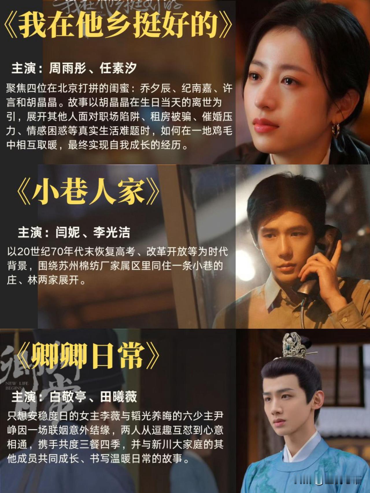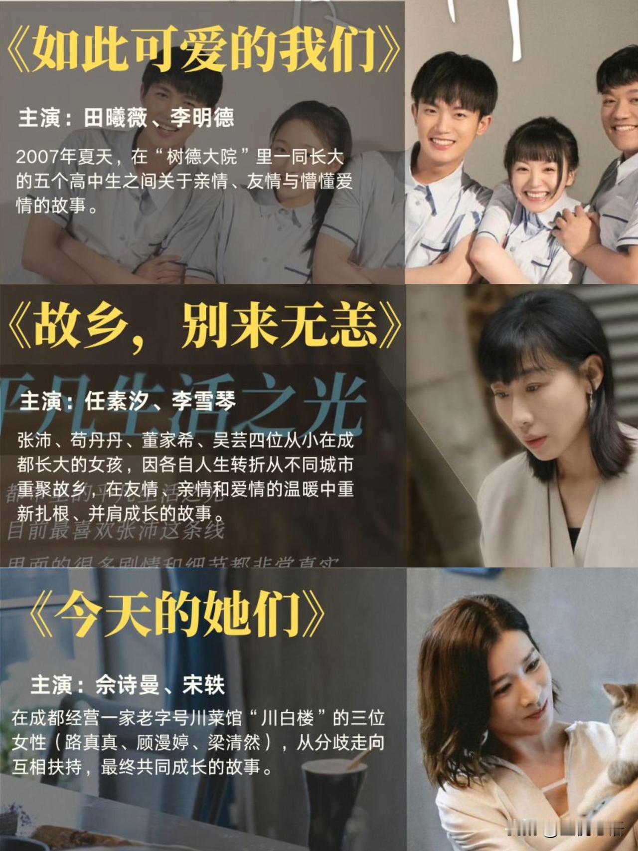 私藏治愈剧单! emo时全靠它们续命 谁还没在深夜emo过啊!分享我N刷不腻的治愈剧单,每部都能抚平心里的褶皱~ 精神出逃就看《去有风的地方》和《我的阿勒泰》!大理的风、阿勒泰的四季,看着看着就觉得生活没那么多焦虑了。 心灵需要按摩?《三悦有了新工作》必须冲!看完才懂,能吹吹风、吃口甜的,就是天大的幸福。《深夜食堂》的家常菜和暖心故事,专治深夜EMO。 情感受伤了?《故乡,别来无恙》《小巷人家》太暖了!友情、亲情的温度,能把所有委屈都融化。还有《卿卿日常》,没有勾心斗角,只有烟火气和姐妹情,越看越治愈。 视觉党别错过《日光之城》《乌蒙深处》,布达拉宫的壮阔、乌江的美景,简直是眼睛的“吸氧”盛宴。 生活已经够累了,就该看点温暖的剧回血~ 剧荒的宝子直接码住,总有一部能治愈你!