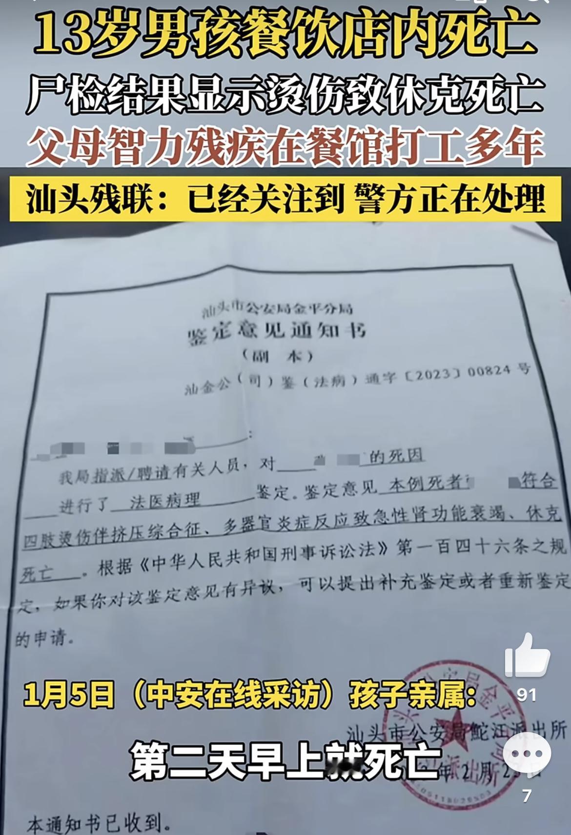 家属称男孩餐馆内死亡未被立案:本案中可能存在什么犯罪行为? 家属称男孩餐馆内死亡未被立案!近日,家属接受采访时称,13岁男孩于2023年1月9日在一家餐饮店内被烫伤致死。小孩父母智力残疾,在这家店帮忙干活约14年。当时男孩想要逃跑,但被餐厅老板女儿强行拉进店内,第二天早上发现男孩死亡! 餐馆老板称男孩感冒致死,但男孩父母发现男孩浑身是伤要求尸检。尸检报告明确死因为“四肢烫伤伴挤压综合征致急性肾衰竭、休克死亡”,医学分析指出大面积烫伤会导致体液流失、器官衰竭,与感冒病理无关。家属称男孩体表烫伤面积超80%,目前一直没有立案。家属称男孩餐馆内死亡未被立案律师来帮忙北京刑事律师 1. 餐馆老板等人或涉嫌故意伤害致人死亡等 首先,根据前述尸检报告来看,男孩大概率不是死于感冒,根本还是死于大面积烫伤。那么,若是餐馆老板等人确实存在强迫男孩劳动的行为,且在强迫其劳动过程中对其施加虐待行为导致该结果,则可能构成故意伤害致人死亡。 故意伤害致人死亡是指行为人故意非法伤害他人身体,导致被害人死亡的结果。行为人在主观上必须具有伤害他人身体的故意,即明知自己的行为会对他人的身体健康造成损害,并且希望或放任这种结果的发生。但对被害人的死亡结果,行为人通常没有直接故意,而是出于过失。 另外,行为人在客观上必须实施了非法伤害他人身体的行为,且该行为与被害人死亡结果之间存在直接因果关系。伤害行为可以是使用暴力、器械攻击,也可是烫伤等其他方式。前述案件中,若受害者是因为餐馆老板等人故意烫伤,最终导致死亡结果,则餐馆老板等人可能构成故意伤害致人死亡。 最后,还需补充的是,若是男孩是在餐馆中自己不慎烫伤导致该结果,餐馆老板等人还是有可能构成过失致人死亡等。 2. 司法人员或可构成玩忽职守罪、徇私枉法罪等 若前述案件中确实存在犯罪行为,但至今涉案人员未被追究刑事责任,那么相关司法人员便可能构成玩忽职守罪、徇私枉法罪等。 所谓玩忽职守罪,指的是国家工作人员严重不负责任,不履行或不认真履行职责,致使公共财产、国家和人民利益遭受重大损失的行为。前述案件中若是确实存在犯罪行为,至今涉案人员都未被追究刑事责任,这就意味着相关司法人员并未履行职责,严重破坏刑事追诉制度的公正性,其可能构成玩忽职守罪。 徇私枉法罪,指的是司法工作人员徇私情、私利,对明知是无罪的人而使他受追诉,或对明知是有罪的人而故意包庇不使他受追诉,以及在刑事审判活动中故意违背事实和法律作枉法裁判的行为。前述案件中若确实存在犯罪行为,并且相关办案人员还存在包庇涉案人员行为的话,则相关办案人员可构成徇私枉法罪。 总的来说,目前该案件引发网络广泛关注,希望相关部门尽快查清案件事实,给孩子家属和社会公众一个交代。