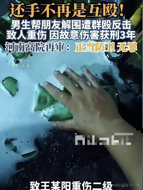 河南,男生见朋友被打帮忙解围,却反遭群殴,被踹倒在地后还拳打脚踢,男生反抗之余,胡乱抓起一个碎了的酒瓶反击,导致对方1人重伤,事后,男生被判有期徒刑3年,但是男生不服,觉得自己属于正当防卫,提起上诉,结果二审维持原判,男生还是不服,他觉得自己被打,出于自保,造成重伤最多就是防卫过当,于是又提起申诉,而再审法院给出了不一样的看法! 2021年12月29号,是姚某申女朋友高某珍的生日,为了庆祝,就在饭店摆了一桌。 并叫了李某深、李某晴、韩某涛、姜某丹、张某新、张某源、王某阳等好友一起参加。 本来好好的日子,却因为一顿生日饭吃出这么大的风波。 原因是吃饭聊天的时候,李某晴突然告诉姚某申,张某源是高某珍的前男友。 就这么一句话,直接让姚某申心里堵够强,好好的生日宴,气氛瞬间变得尴尬起来。 直到吃完饭,姚某申的火气都没消,好友李某深提议不如找个机会揍张某源一顿出出气。 姚某申一听,觉得建议不错,几个人一商量,决定一会提议送张某新和张某源回家,然后在路上直接动手。 用餐结束后,几人一同乘车回家,车子开到某中学附近,姚某源突然就让张某源下车。 张某源以为有啥事,结果刚下车,姚某申和李某深几人二话没说,对着张某源就是一顿拳打脚踢。 这时候,同行的张某新看不下去了,他不知道发生了什么事,但是看到几人打架,他本能的上前拉架。 但是他一个人根本拉不住,为了让大家停手,他大喊在打我就报警了。 可谁能想到,这句话不仅没制止住暴力,反而把祸水引到了自己身上。 李某深一听要报警,火气更旺,抬手就给了张某新一耳光。 然后其他几人转头开始围殴张某新,对着他一顿拳打脚踢。 张某新被打懵了,无力反抗,其中王某阳下手尤其狠,直接把张某新一脚踹到了路边的沟里。 可就算这样,他们还不罢休,几个人跟着跳进沟里,继续对着张某新一顿猛打。 张某新被围在沟里,四面八方都是拳头和脚,孤立无援,只能本能地反抗。 慌乱之中,他抓到了地上的一个碎酒瓶,然后朝着周围的人挥了过去。 万万没想到就是这一下,导致王某阳的面部和眼睛受伤。 同时打人的其他几人瞬间愣住了,担心张某新拿酒瓶继续反击,竟然丢下受伤的王某阳拔腿就跑。 张某新忍着疼痛的身体冷静过后,看到受伤的王某阳后赶紧拿出手机报警。 经过调查,张某新,李某晴,李某深、姚某申属于互殴。 李某深和姚某深被行政拘留了12天,还各罚了1000块钱。 李某晴也被行政拘留10天,罚款1000块。 而王某被救后,伤情被鉴定为重伤二级,目前一直在医院接受治疗。 《刑法》第234条规定,故意伤害他人身体,致人重伤的,处3年以上10年以下有期徒刑。 张某新因故意伤害罪被移交到检察院提起公诉。 但张某新辩称自己是正当防卫,自己被围殴时,情急之下才弄伤了王某。 最主要自己当时并不知道那酒瓶子是坏的。 可是一审法院却认为,张某新的行为虽然构成防卫,但已经对王某造成了重伤伤害,超过了必要限度。 因此张某新被判故意伤害他人身体,致人重伤,已经构成了故意伤害罪,最后判处他有期徒刑三年。 这个判决让张某新彻底懵了,他明明是为了阻止打架,自己还被人围殴,怎么反倒成了罪犯。 不甘心的他提起了上诉,可二审法院还是裁定驳回上诉,维持原判。 一纸生效的判决,不仅让张某新要面临三年牢狱之灾,更让他失去了原本的生活。 案发时他还是某高校的在校学生,因为这个判决,学校依法将他开除,他的大学梦戛然而止。 张某新还是不服,他始终认为自己是正当防卫,于是又继续提出申诉。 没想到,再审法院受理了他的申诉后,并没有简单地维持原判。 而是仔细梳理了整个案件的来龙去脉,重新审查了所有证据。 再审法院最终认定,这起案件的起因是姚某申因为张某源和自己女友的过往关系心生不满。 主动策划了殴打张某源的行为,而张某新对这一切完全不知情,也和案件起因没有任何牵连。 张某新一开始是出于善意制止众人对张某源的不法侵害,才上前劝阻。 结果却反遭殴打,甚至被踹进沟里持续攻击。 他捡起碎酒瓶还击,完全是出于本能的自卫,目的是为了保护自己不被继续伤害。 并不是主动去伤害别人,这根本不属于互殴,属于正当防卫,而且他的防卫行为也没有明显超过必要限度。 最终,再审法院撤销了之前的判决,改判了张某新无罪。 更让人感动的事,之前的判决让张某新已经被学校开除失去学籍,为了不让事情毁了他的一辈子。 再审法院还主动跑到张某新原来的学校,和学校方面积极协调沟通。 最终成功帮张某新恢复了学籍,让他能够回到校园,继续完成自己的学业。 如今,张某新已经重新回到了校园,继续自己的学业,那些意外带来的阴霾,也正在公正的阳光逐渐驱散。 对此,你怎么看呢? @静心法谈 学法辨是非,慬法不吃亏。