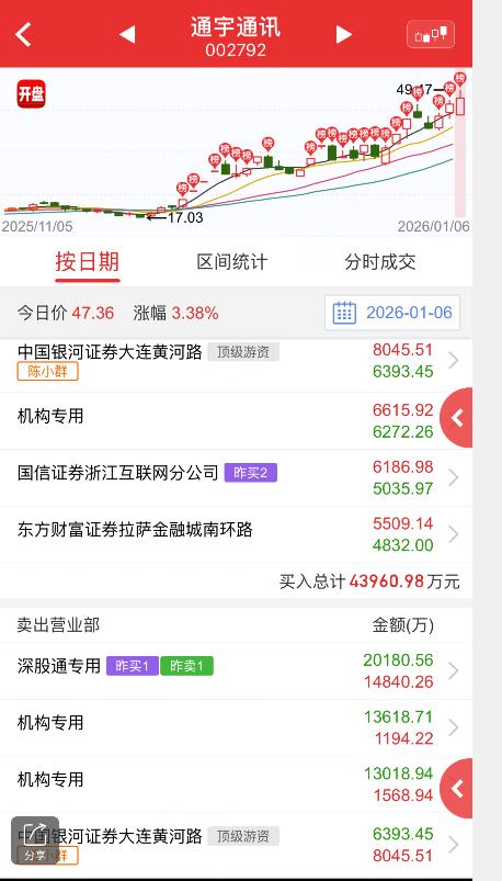 鲁信昨天跌停,今天涨停,龙虎榜上显示,陈小群买了两个多亿,原来是他出手,封板肯定也是群总,一群人都在吹,明天消闲派又要来顶一字了,之前陈小群买了雷科,第二天就被顶一字板,不过他今天板上减仓了6000万,里面估计还有几个亿。此外,通宇加仓做T,很显然,陈小群非常看好商业航天板块,平铺了,真是赚嘛了啊!他之前说过,主线就在这里你不敢上,偏要自己单开一桌,不过散户并没有这些游资资金大,如果对盘面理解不透彻,天天追涨杀跌,即使3万亿的牛市,依然会亏钱,大家认为呢?