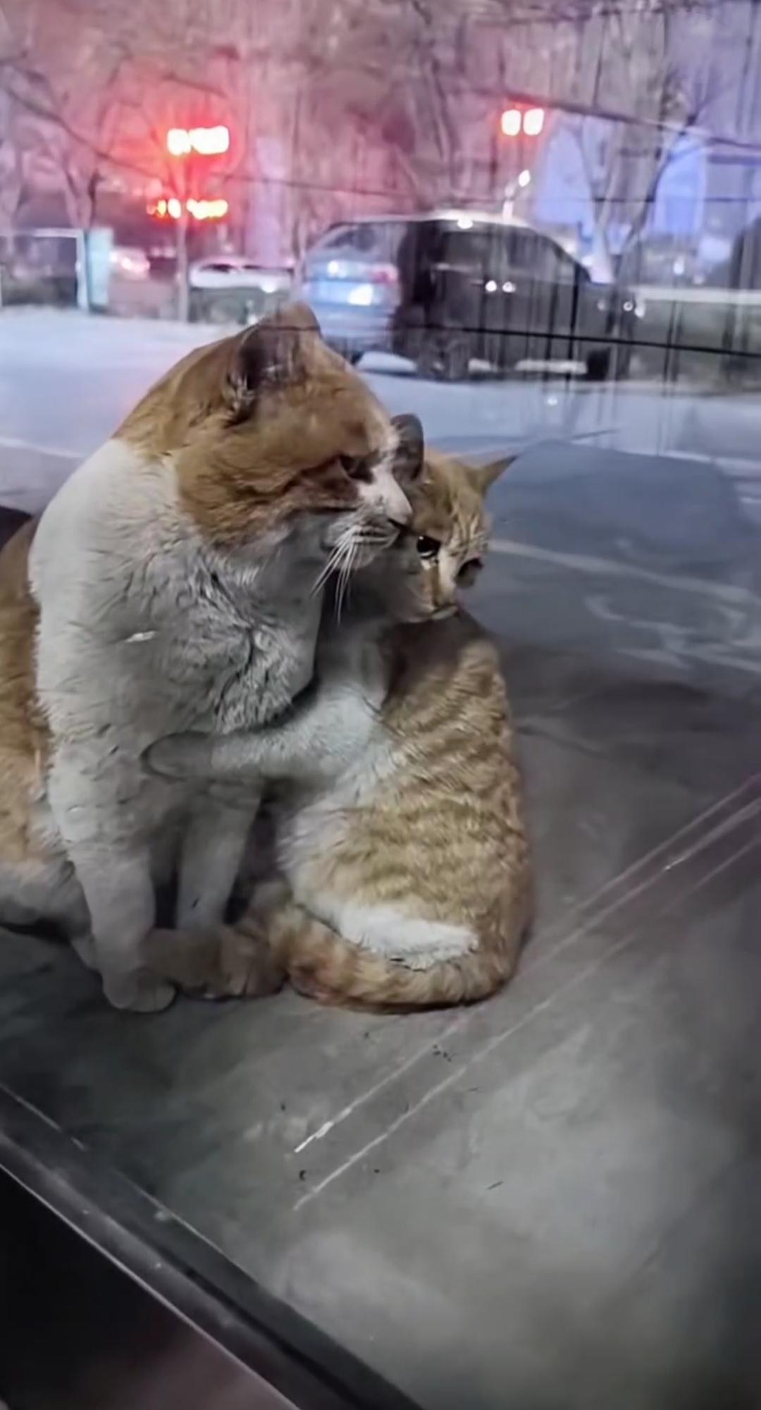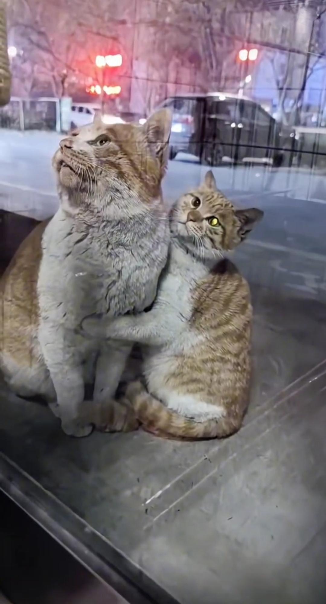 最近降温厉害,街头一商户玻璃前蹲了对流浪猫母女。 小猫缩在妈妈怀里,毛都冻得炸起来,尾巴缠得紧紧的,鼻子蹭着妈妈脖子,连叫都带着颤音。 猫妈妈耳朵缺了块,身上毛打结,沾着灰,估计流浪大半年了,小猫才几个月大,眼睛圆溜溜的,总用脑袋顶妈妈下巴,像在要安慰,它们蹲在玻璃前,偶尔小猫叫两声,妈妈就用舌头舔舔它耳朵,像在说“再等等”。等商户打烊都九点多了,猫妈妈才敢凑过去,扒着垃圾桶边缘,翻出半盒冷掉的盖浇饭。 有人路过递了根火腿肠,猫妈妈先凑上去闻了三遍,尾巴竖得直直 的,确认后才让小猫凑过来,小猫狼吞虎咽,嘴边沾着肠衣,妈妈就蹲在旁边看着,自己没动一口。有人想摸小猫,猫妈妈立刻炸毛,喉咙里发出低鸣,把小猫护在身后。 北京小动物保护协会说过,城市里的流浪猫平均寿命就2-3年,冬天是道坎,低温能冻得它们爪子红肿,翻垃圾桶找不着热食,下雨只能躲车底或楼道角落,这对母女算机灵的,选了商户门口,这里人多,总有好心人愿意递口吃的。还有养过流浪猫的阿姨说,流浪猫妈妈都“护 崽成魔”:之前她喂过一只猫,把小猫藏在快递柜里,自己每天跑三公里找食物,哪怕自己饿得瘦成皮包骨,也要把鱼干叼回去。 其实很多流浪猫不是天生“野”的,比如这只猫妈妈,说不定之前是家猫,它会用爪子扒拉玻璃,盯着里面的人看,动作里带着点熟悉,有人说,流浪猫里六成是被主人遗弃的,要么嫌麻烦,要么嫌猫老了病 了。 它们从家猫变成流浪猫,得重新学怎么找吃的、怎么躲坏人,过程比想象中难多了。 流浪猫的警惕不是“怕人”,是“怕受伤”,之前有只流浪猫被人用石头砸过,之后见人就跑,哪怕你递食物,它也得等你走了才敢凑过去,这对母女的猫妈妈,眼睛里有戒备,但看到有人蹲下来递食物,还是慢慢把耳朵放平了,它知道,要让小猫活下来,得放下点警惕。 还有人说,流浪猫会“记恩”:你喂它一次,它可能每天蹲在路口等你,哪怕只是蹭蹭你裤腿。 有人评论“这猫妈也太会算计了吧,等打烊去抢剩饭,”其实哪是算计,是熬出来的生存经验,猫妈妈不是想“抢”,是没办法,它得让小猫吃饱,得让它活过这个冬天。 那些“算计”的背后,都是没说出口的“我要护着它”。 这对流浪猫母女的样子像根小刺,扎得人心里发疼,蹲在玻璃前的身影,舔小猫耳朵的动作,还有翻垃圾桶时的小心,都在说“我们想活着”,可街头还有多少这样的流浪猫?它们躲在车底、楼道、垃圾桶旁边,熬着冷天,等着一点善意。 我觉得流浪猫不是“麻烦”,是需要搭把手的小可怜,哪怕出门带包猫粮,或者把旧毛衣改成窝,就能让它们多熬两天,上次我遇到只流浪猫,给了根火腿,它居然跟着我走了一段,不是要跟我回家,是凑过来蹭了蹭我手背,像在说“谢谢”。其实动物的感恩很简单,你给它一口吃的,它就把你当“恩人” 你遇到过流浪猫吗?