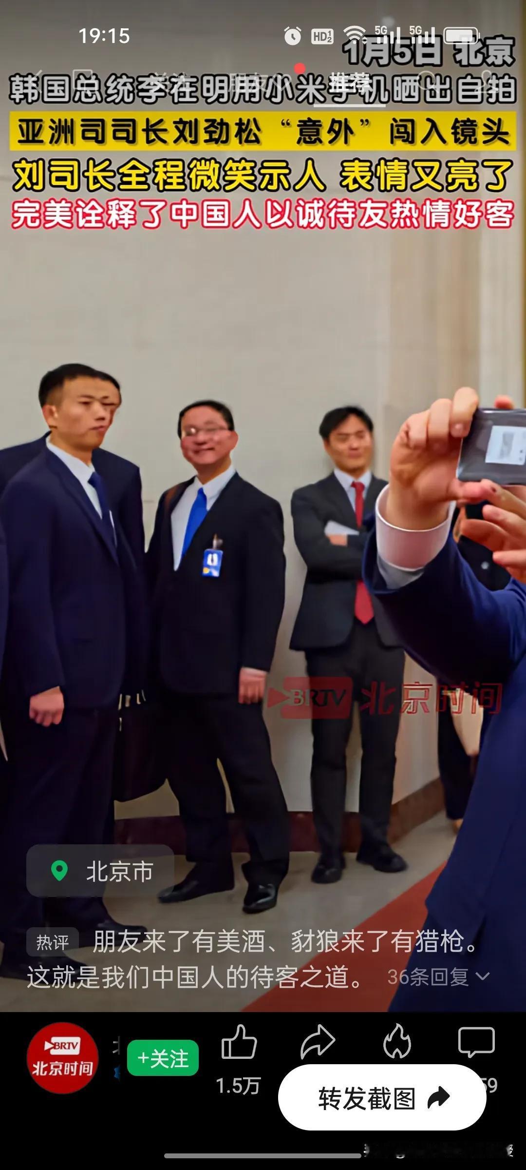 全网都在传下图的视频,昨天韩国总统李在明用小米手机晒出与妻子的自拍,这是小米手机的高光时刻,背后就是亚洲司司长刘劲松和同事们,画面中刘司长全程微笑,双手也没插兜,他看着韩国总统拍照片,完美诠释了中国人以诚待友。 韩国网友更有意思,拿去年11月18日刘司长见日本外务省亚洲大洋洲局局长金井正彰时双手插兜交谈的照片进行对比,当时日本首相高市早苗拒不认错,刘司长对记者说,谈判当然不满意,表情非常严肃。 这一对比恰是中国外交的真实写照:对秉持善意、尊重彼此的客人以诚相待,尽显温和;对触碰核心利益、拒不认错的挑衅者立场鲜明,寸步不让,礼尚往来从来都是以尊重与底线为前提的。给刘司长点赞[赞][赞][赞]