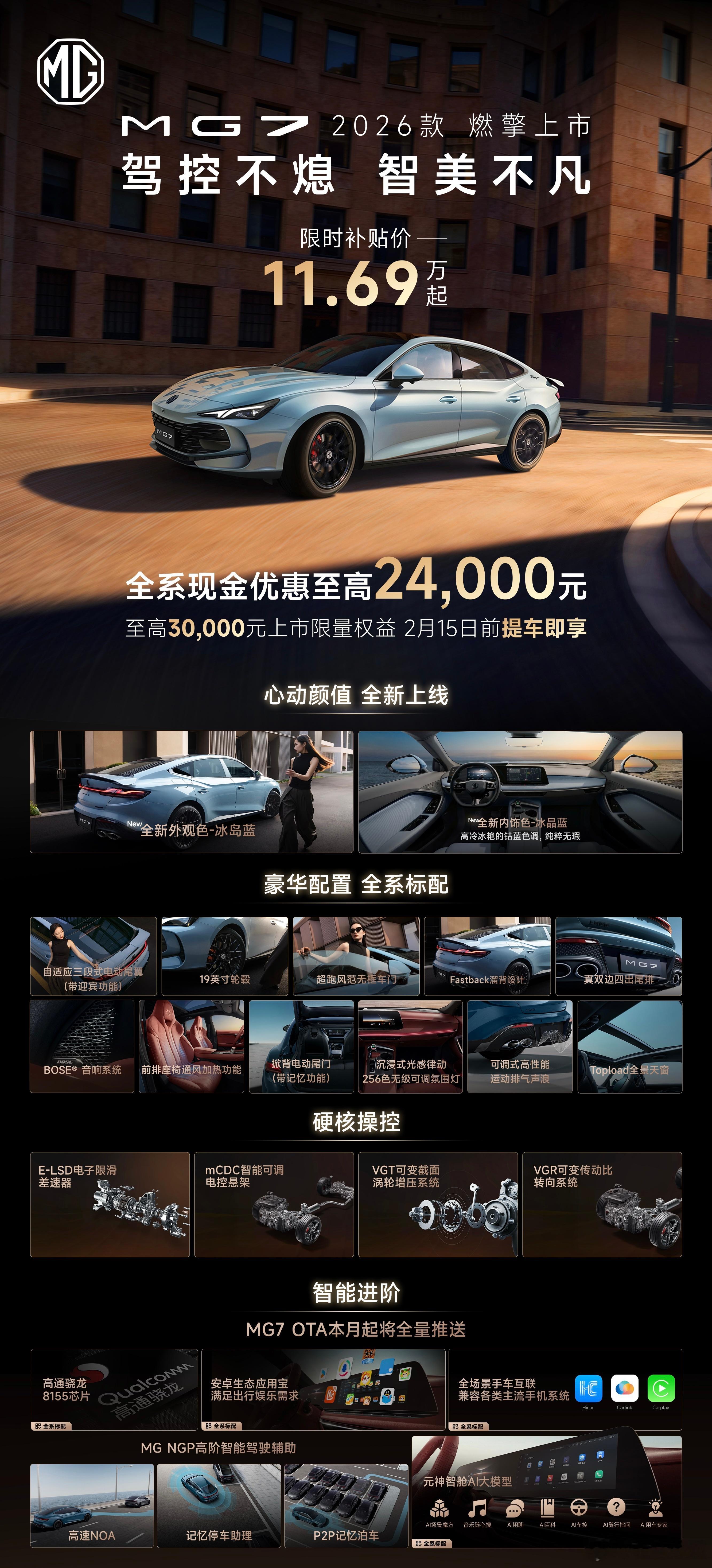 2026款MG7上市,主打一个全系标配,三段尾翼、大轮毂、四出排气.....入门车型就能拥有,太狠了也,喜欢的赶紧冲吧,真的是年轻人的第一台轿跑MG7汽车 广州