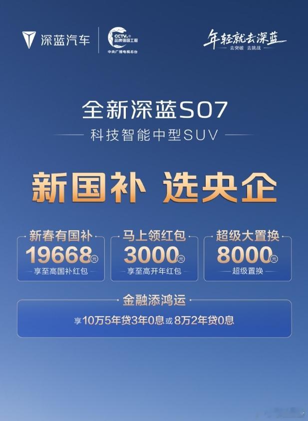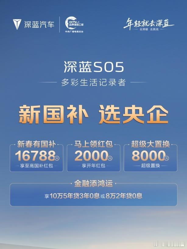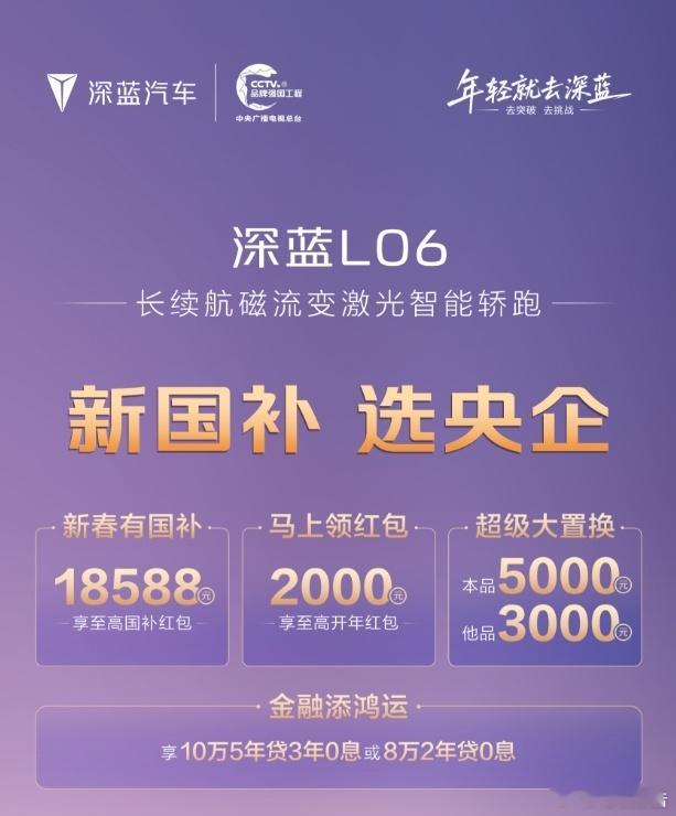 新国补政策出来之后,各家车企都在补贴,深蓝汽车的也同步一下给大家,简单来说就是国补至高2W+1W元开年红包+置换至高0.8W+金融5年0息(注意”至高“二字,根据实际车型、价格情况为准)以深蓝L06举例,国补可享18588元红包+2000元开年红包,置换方面本品5K,他品3K,当然时限为2月28日之前新国补选央企新春开深蓝回家深蓝汽车至高补贴2万元