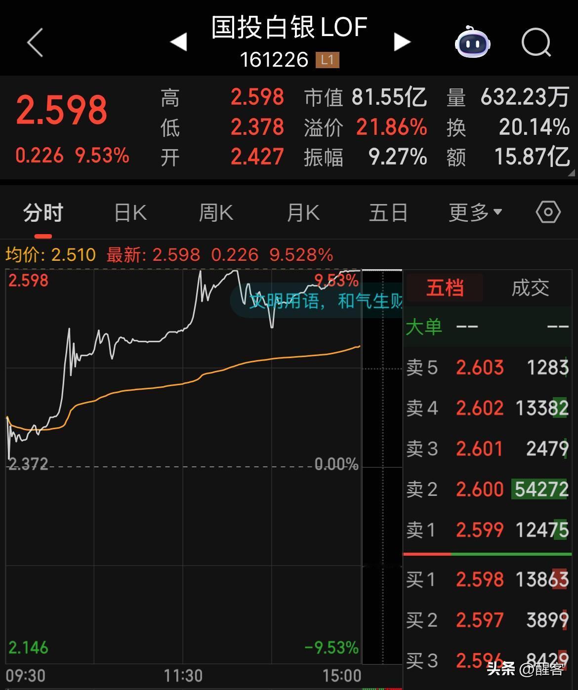 国投白银LOF今日再度几乎涨停,溢价率上升至21.86%,根本抑制不住炒作的狂热,所以监管再一次开展在9:30-10:30之间停盘。 不过按照白银现货、期货以及沪银主连近两个交易日是走势来看,几乎都回到了之前历史新高的跌幅附近。 国投白银LOF作为唯一一只在二级市场交易的产品,如此狂热又失去理性的炒作方式确实很有大A的风格。就如同被爆炒的科技大票一样,市盈率几千、几百比比皆是,而反观世界顶级科技其实的市盈率一般都在20-30之间已属过热行情了。 溢价高达21.86的白银LOF相对于黄金的0.33%溢价确实是一场“击鼓传花”的游戏,鼓声未停游戏继续,鼓声一旦抬起,迎接投资者的又将是连续的跌停风险。