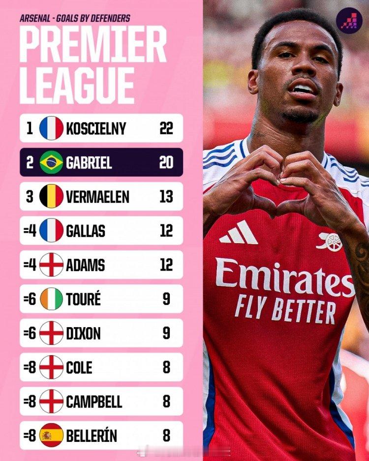 Opta统计阿森纳队史后卫英超进球数量,科斯切尔尼22球居首,加布里埃尔20球次席,这个榜单毫无疑问将来很长一段时间都会被可爱的加布兽霸占了,毕竟年轻,且进球效率那么高阿森纳后卫英超进球榜:科斯切尔尼——22加布里埃尔——20维尔马伦——13加拉——12亚当斯——12图雷——9迪克森——9阿什利·科尔——8索尔·坎贝尔——8贝莱林——8 英超联赛 阿森纳著名教授
