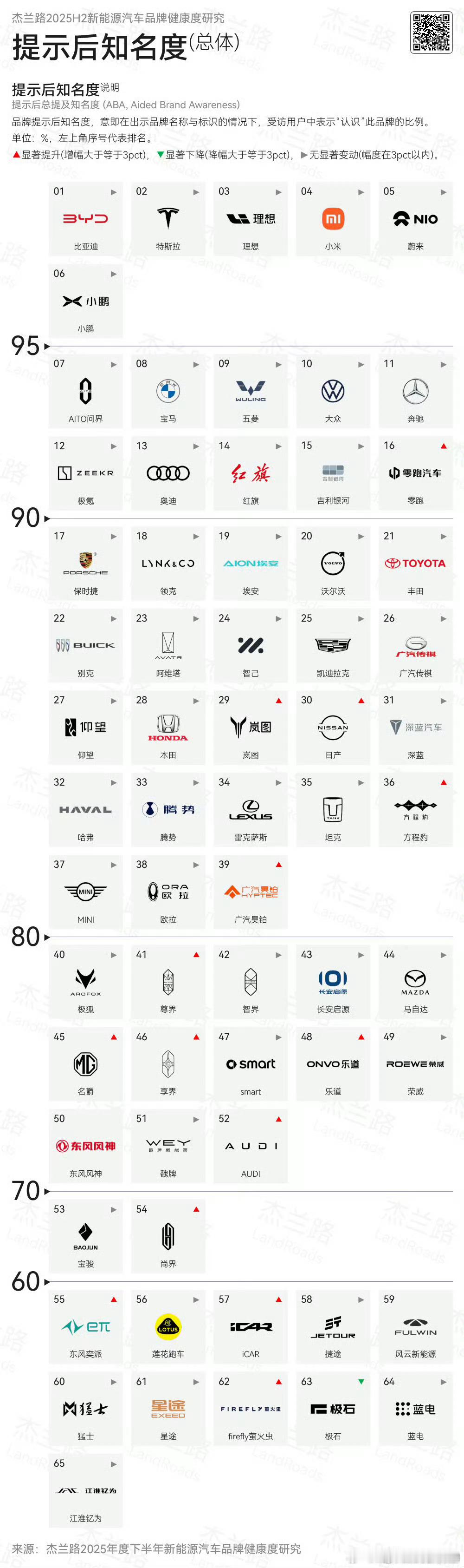 这张图还挺有意思的用户对新能源车品牌的认可度排名第一梯队比亚迪、特斯拉、蔚小理米这个在国内是公认的了,没毛病但第一梯队没有华为系我有点意外,第二梯队里才出现问界,这是没想到的。零跑真是闷声发大财,战略很了不得,而且认知度还在上升,别人都没动BBA、大众、吉利、红旗、五菱,这是国内消费者最喜欢的几个传统品牌,所以他们从来不会是杂牌第三梯队里哈弗、坦克、方程豹、仰望、腾势、智己这些品牌才出现,岚图、日产最近势头猛,再加上传统品牌的优势,势头很猛再往后的,其实宏观角度也都不错,维持着没问题,但谁都想过得好一点没错,这就需要一些特定的技能了,想想怎么出圈、造有特点的车,奕派、iCAR、萤火虫都有特点,大家接受度就慢慢变高,同质化严重的也就没啥意思了用户买车看这张图挺有参考性的,靠前的买肯定没错,红箭头势头向上的买也可以,可能还有惊喜