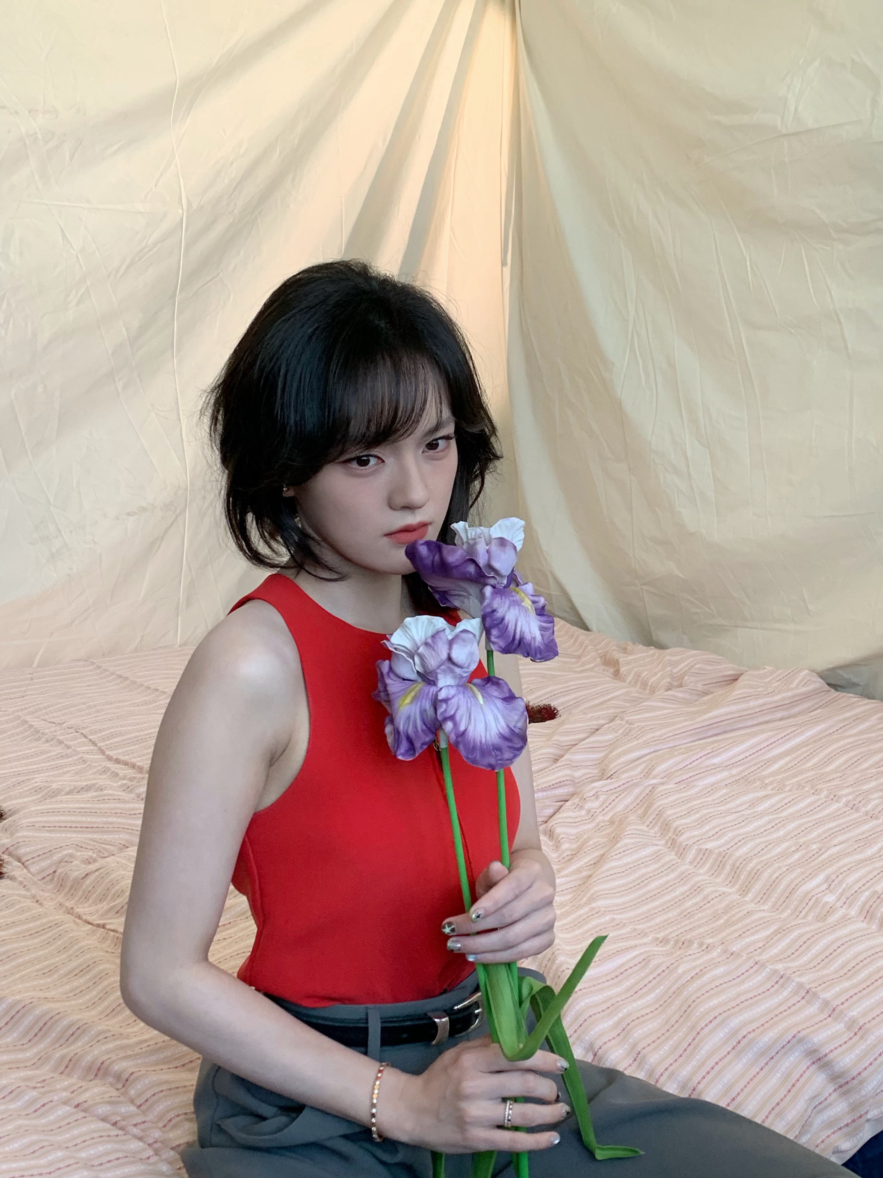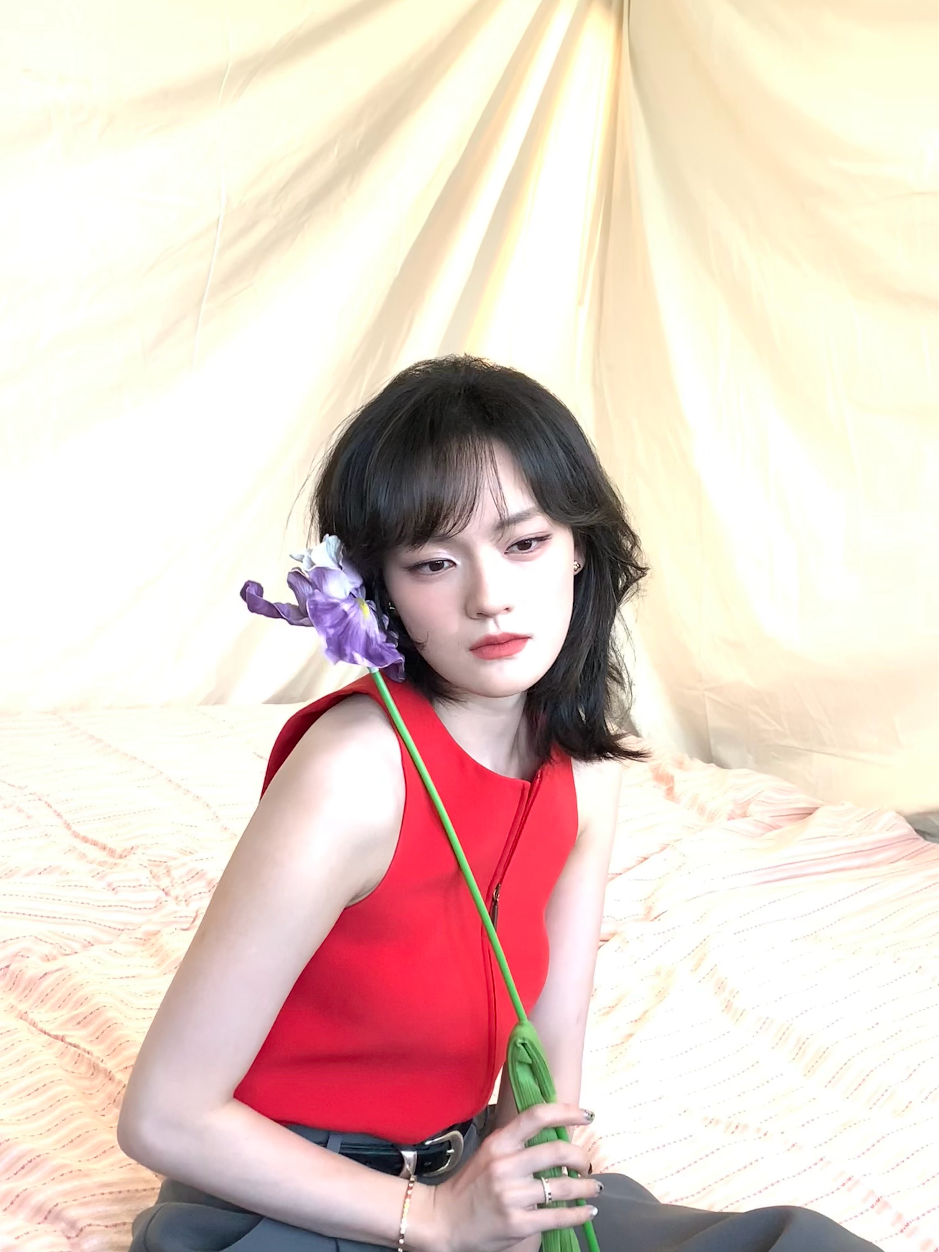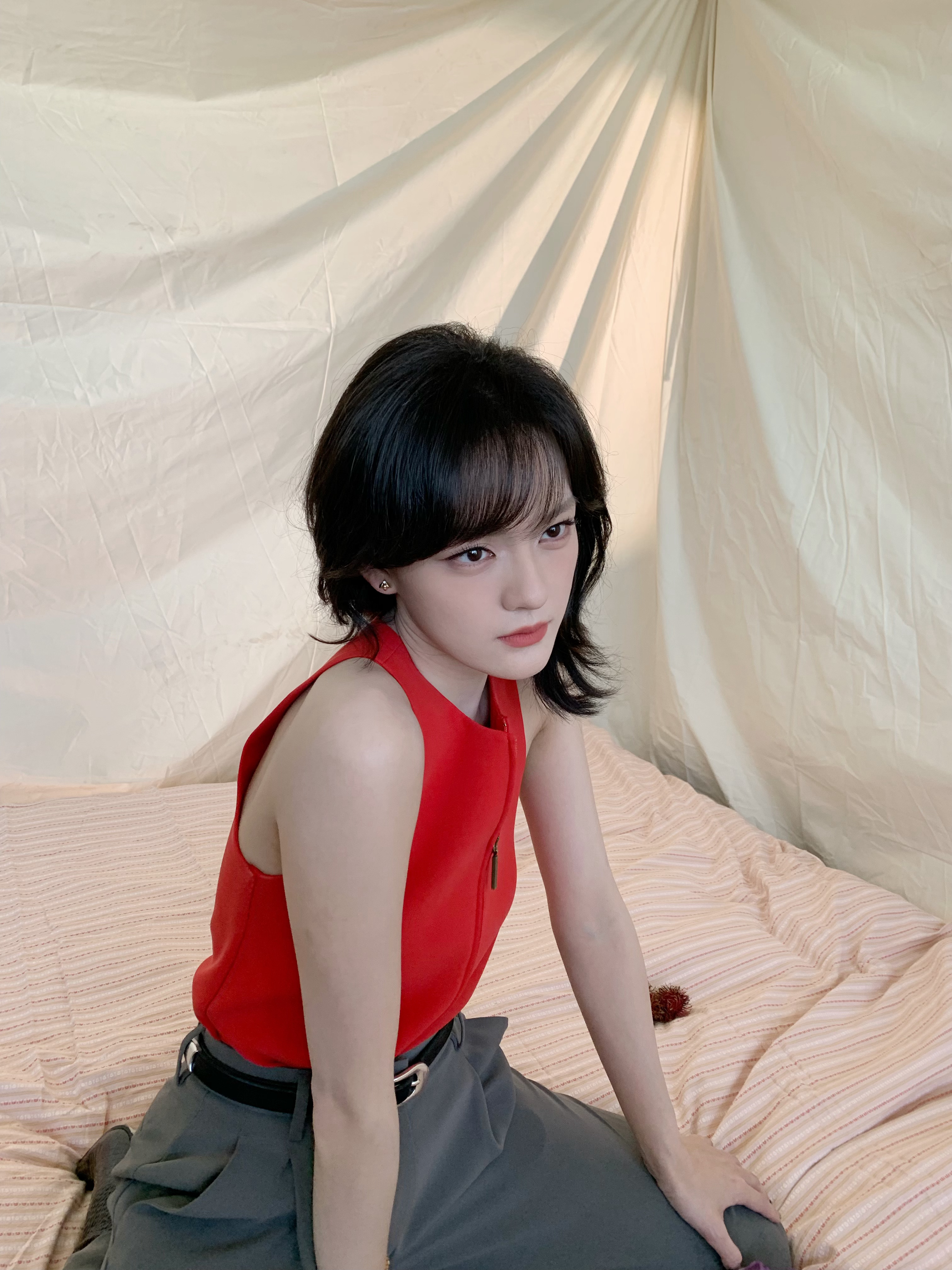 摄影棚内,以一身松弛有度的红,写就摩登风骨。无袖红衫似一道灵动的锋线,西装长裤携着率性的垂坠感。红唇是点睛的封印,蓬松卷发如海藻般漾开复古的浪漫波纹。静立时是清冷画报,走动间便成了流动的风景。文淇文淇深圳活动文淇红色背心