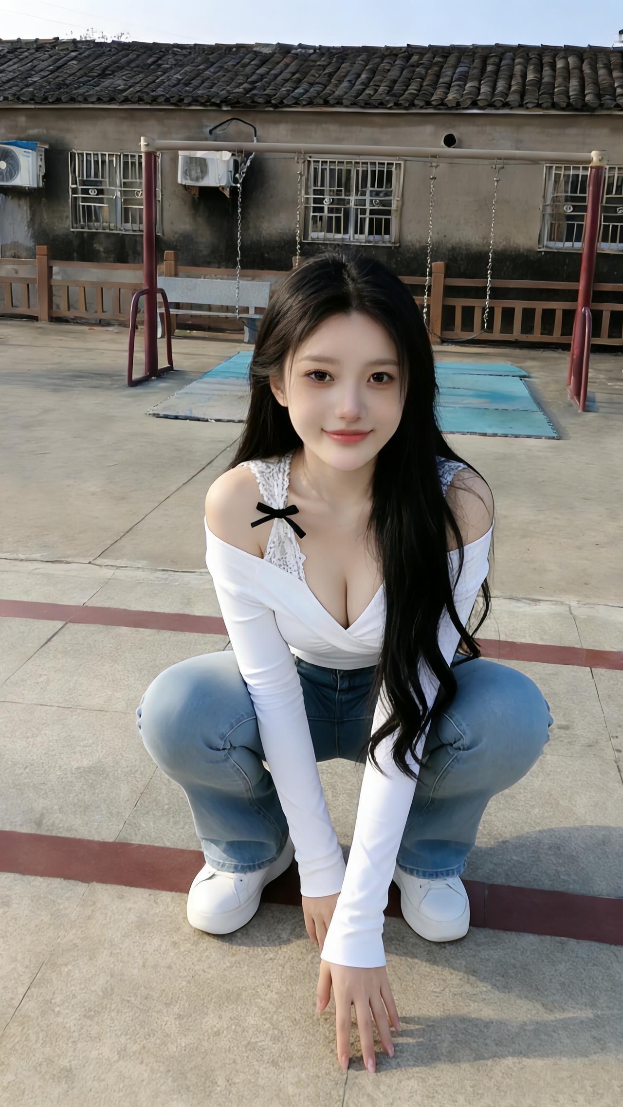 都市丽人蹲拍,时尚穿搭与自然风景的完美融合。