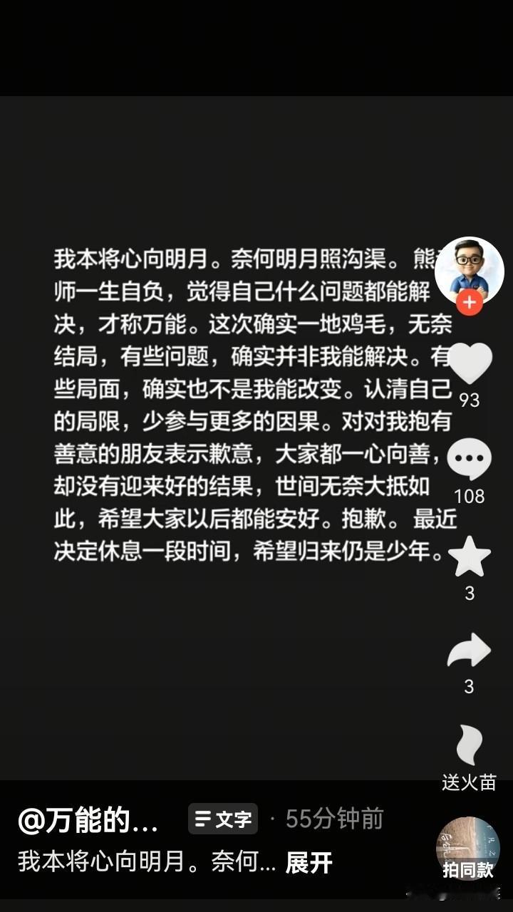 小米本想“招安”“万能的大熊”,让长期抹黑小米的熊老师改改口风,多夸夸小米,但遭到“米粉”们的强烈抵制!米粉们认为:小米不应该与抹黑小米的熊老师合作!伤害了米粉们的感情! 随即,小米发布公告,对于团队接触KOL一事,情况属实,严重违背了公司的原则!已终止与KOL的接触! 对涉事负责经办人员,做辞退处罚!集团副总裁CMO许斐和集团公关部总经理徐洁云承担管理失职责任,予以通报批评!扣除2025年绩效和年度奖金! “万能的大熊”发布视频,表示自己将休息一段时间,并用两句诗词表达了自己的心情:我本将心向明月,奈何明月照沟渠!
