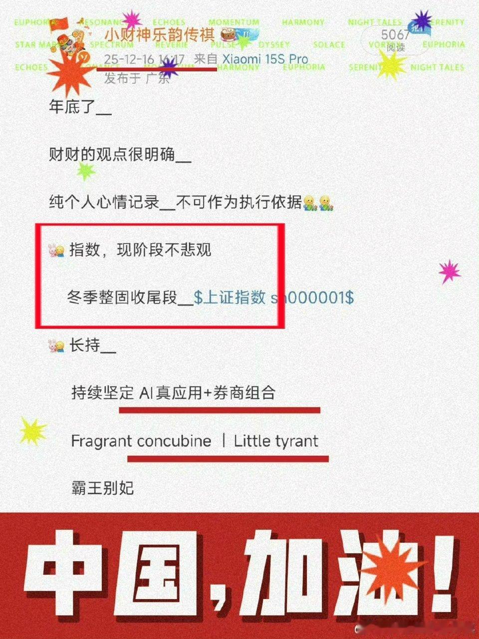 如图、12月中旬无数大V焦躁、放弃,甚至预言寒冬(最近他们肯定又空翻多了)我们坚定:不悲观+冬季整固尾声长持继续霸王别妃+哈利波特(波特利)短持主攻丧标所有内容仅为个人研究心得和投资心情日记,不构成任何买卖建议丨市场瞬息万变,走势受多重因素影响,大家务必结合自身风险承受能力独立判断,投资决策请自己做主丨真金白银的操作权在你手里丨投资有风险,入市需谨慎丨