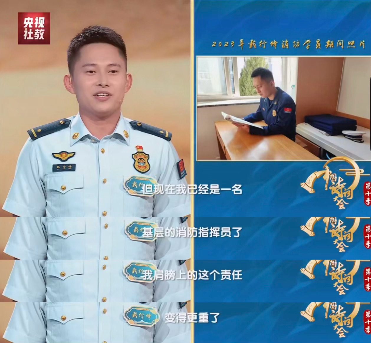 一个人十年的变化能有多大 谁懂,看到选手戴行锋在诗词大会上的表现,真的被他这10年不变的诗 心给打动到了,从消 防 学 员到如今的指 挥 员,时间在过去,但他对工作、对诗词的热爱一直都没有改变。