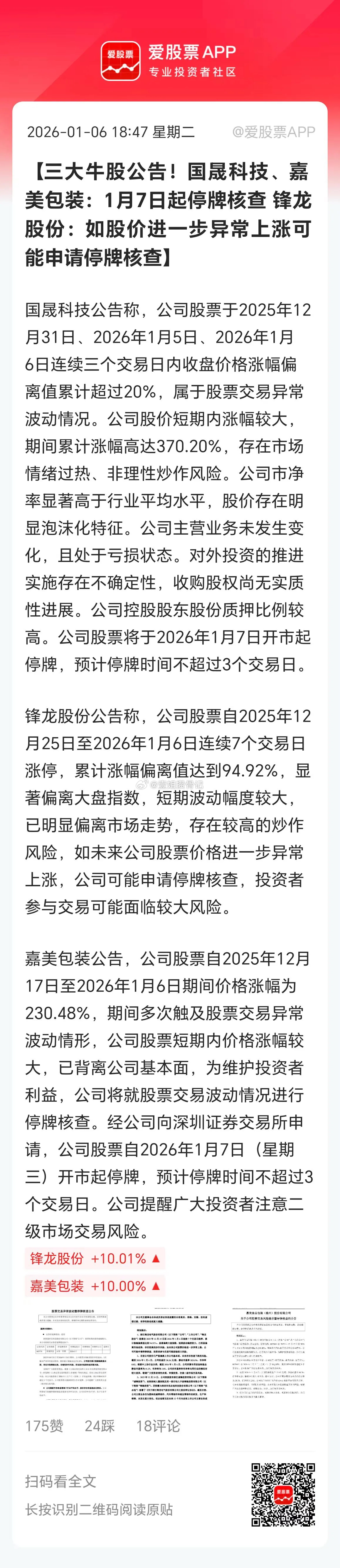 今晚国晟科技、嘉美包装双双停牌核查,锋龙股份警告再异动上涨就申请停牌!还有一堆商业航天、脑机的公司出降温的公告:1、3天2板航天电子:存在市场情绪过热及非理性炒作的情形;2、2连板航天长峰:目前公司未实际开展脑机接口等相关业务、不从事商业航天相关业务;3、3连板中国卫通:股价已严重脱离基本面 公司股票击鼓传花效应十分明显;4、中国卫星:股价短期涨幅过大 存在市场情绪过热风险;5、航天环宇:预计2025年公司商业航天相关收入占比不足15%;6、20CM两连板三博脑科:公司目前不涉及脑机接口产品的研发、生产及销售。7、20CM两连板伟思医疗:在脑机接口领域的新产品仍处于市场培育初期。开年这2天有点去年924的味儿了,监管要刹刹车!毕竟我们大A要走慢牛的,不能跑这么快。