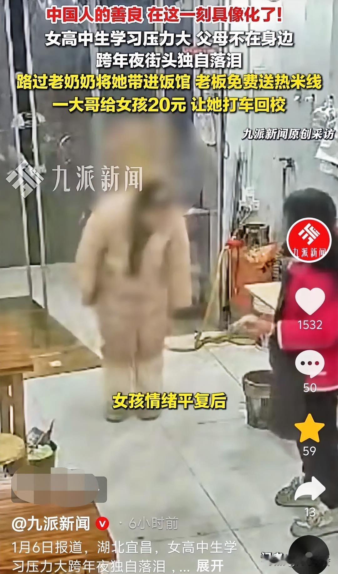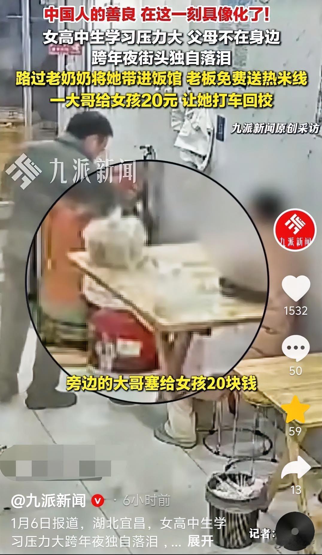 近日,湖北宜昌,雨天,气温接近零度,一位老奶奶带着一名女孩走进饭馆。女孩满脸泪水,老奶奶在一旁不停地劝说着。 老板一开始以为她们是祖孙关系,但是从她们的对话中了解到,原来她们并不认识。老板连忙走过去了,老奶奶问还有没有吃的? 据了解,原来女孩是一位高中在读的学生,因成绩压力太大而非常沮丧。女孩一个人在街头行走,在饭馆门旁哭了起来。 碰巧老奶奶路过,见此情景心生怜悯,由于室外太冷,老奶奶便把女孩领进店里,给她要了一碗面。女孩说,她的父母并不在身边,自己在学校就读。 女孩吃饭的时候,老奶奶过来付钱,女店员也了解了情况,并没有收,还表示不仅她现在吃的不要钱,老板还煮一碗米线送给她。 旁边一位坐着等米线的大哥,禁不住对女店员竖起大拇指,说天气太冷,有必要加一碗米线。女店员走过去安慰女孩,你放心吃吧!不要钱。 老奶奶在旁边一直安慰女孩,旁边的大哥也跟着加入了拉家常。慢慢的,女孩的情绪恢复了一些 老板给女孩端过来一碗热腾腾的米线。 旁边的大哥在了解到女孩在学校住读时,给了她20元钱,并叮嘱女孩,吃完了打车回学校。老奶奶看女孩情绪正常,临走时也叮嘱她要爱护好自己。 女孩吃过饭,来到前台又要付钱。老板坚决不收,还安慰和鼓励她。女孩临走时,深深地鞠了一躬。 看了视频,这个瞬间真的藏着普通人最暖的善意,特别暖心。雨天零度的冷,被一碗面、一碗米线、20块钱车费的暖给彻底中和了。 老奶奶的主动帮助是这份善意的起点,她看到了陌生女孩的沮丧和无助,没有旁观而是主动伸出援手;饭馆老板的免单加赠米线,是把这份善意接过来又添了一把火,用最实在的方式给女孩添了份温暖;旁边大哥的20块钱车费更贴心,考虑到了女孩之后的归途。他们都是平凡人,做的也都是小事儿,但这些小事凑在一起,就成了能照亮人低落时刻的光。 其实很多时候,治愈人的从来不是什么惊天动地的大恩,而是这种陌生人之间不求回报的小善意。女孩在情绪沮丧时遇到这些,应该会记很久吧,说不定以后她会把这份温暖传递给别人。(来源:九派新闻)